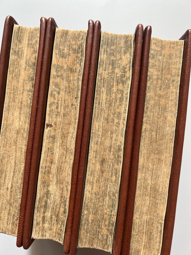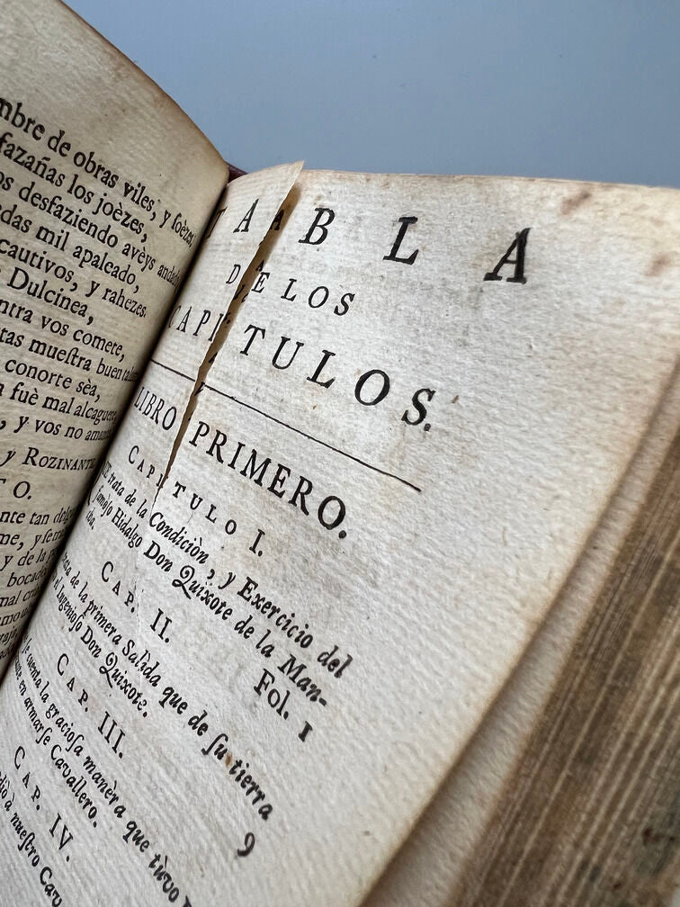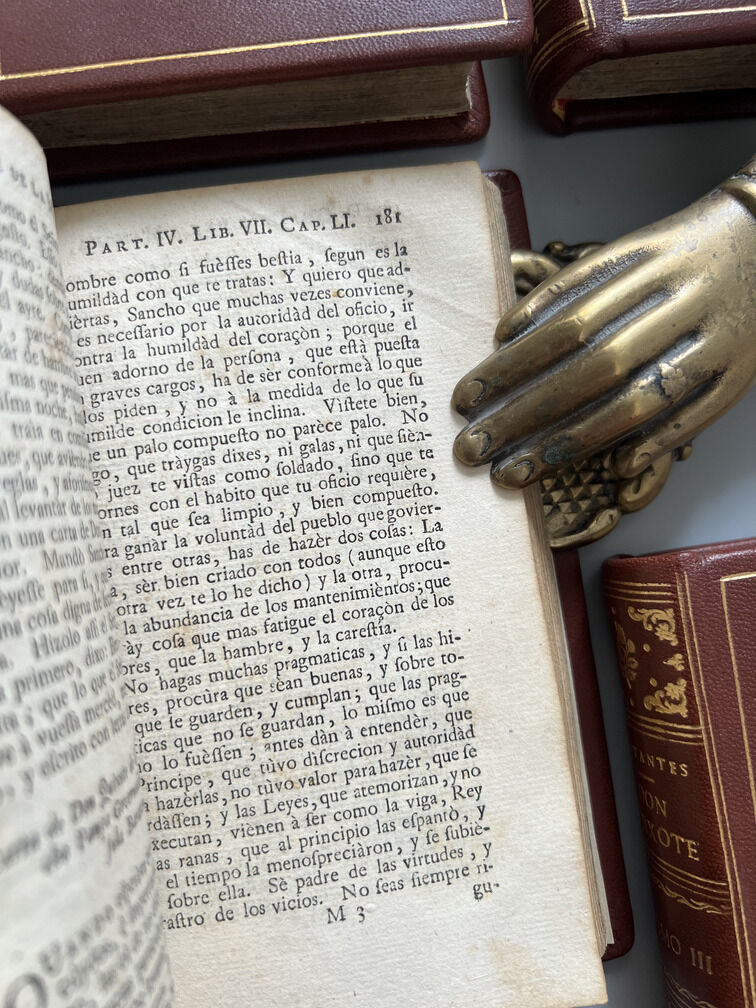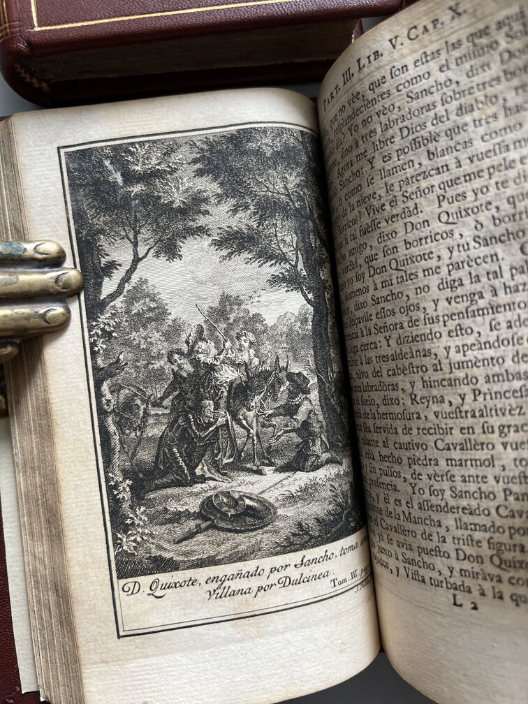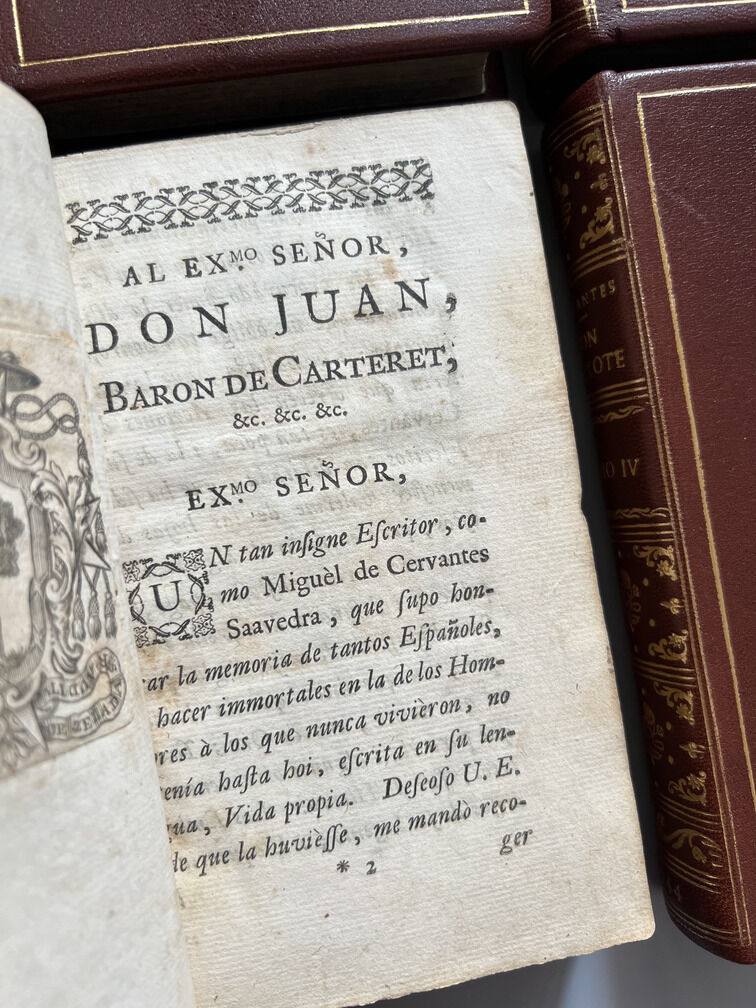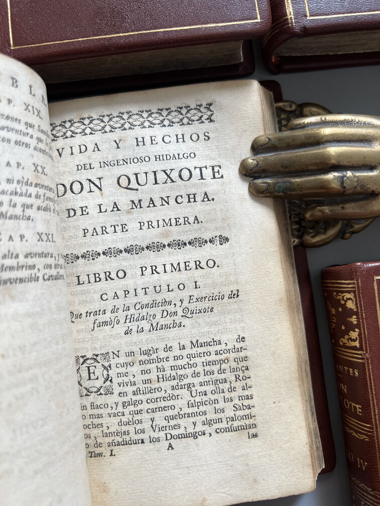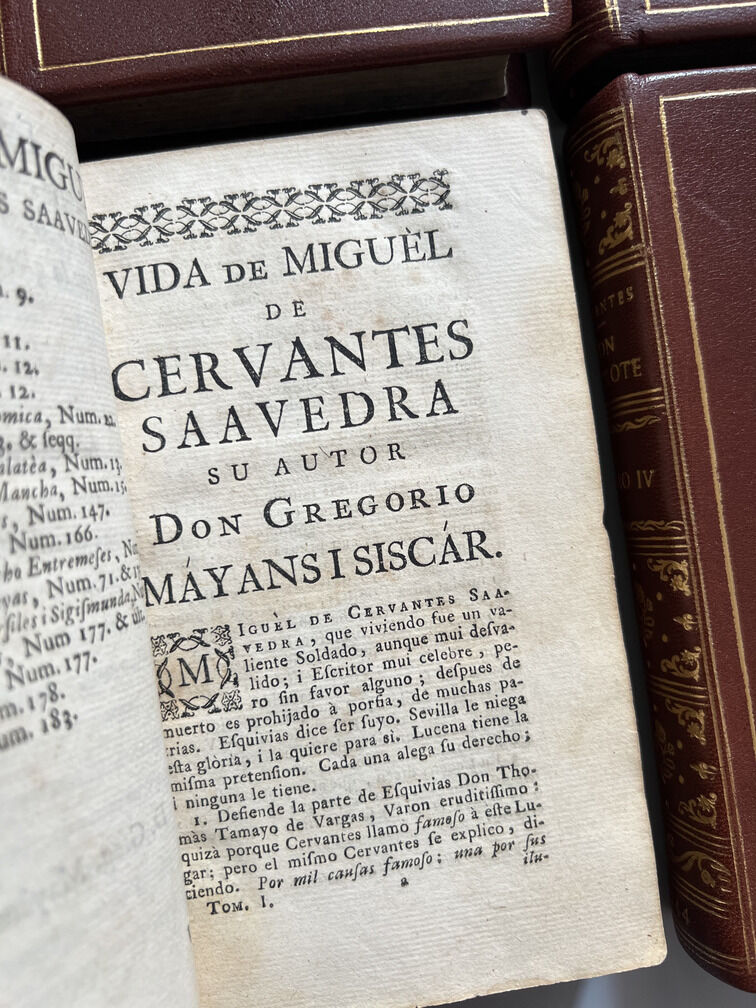 Observaciones: Cuatro volúmenes, completo. 4 vol. en 8º. I: 1 b. + 2 h. + VII + 175 p. + XVI + 2 h. + 224 p. + 3 lám. Sin el retrato de Cervantes. II: 1 b. + 4 h. + 406 p. + 3 lám. III: 4 h. + 414 p. + 7 lám. IV: 1 b.+ 4 h. + 407 + 10 lám. (de 11 según Palau).. Contiene 23 grabados realizados a partir de los dibujos de Coypel, pintor de corte del rey de Francia. Sin el retrato del autor. Portadas a dos tintas con grabado tipográfico, la del IV volumen remontada. Encuadernado en plena piel reciente con detalles dorados. Rasgadura sin pérdida en una hoja del primer y del cuarto volumen (ver imágenes). Tenues y esporádicos puntos de óxido. Ex libris heráldico en todos los volúmenes. Palau 52012 comenta "esta edición del Quijote es buena...". Bardón (2016) "Apreciada edición impresa en la Haya en lengua castellana, arreglada según la de Londres de 1738. Con la vida de Cervantes por Gregorio Mayans y Siscar.