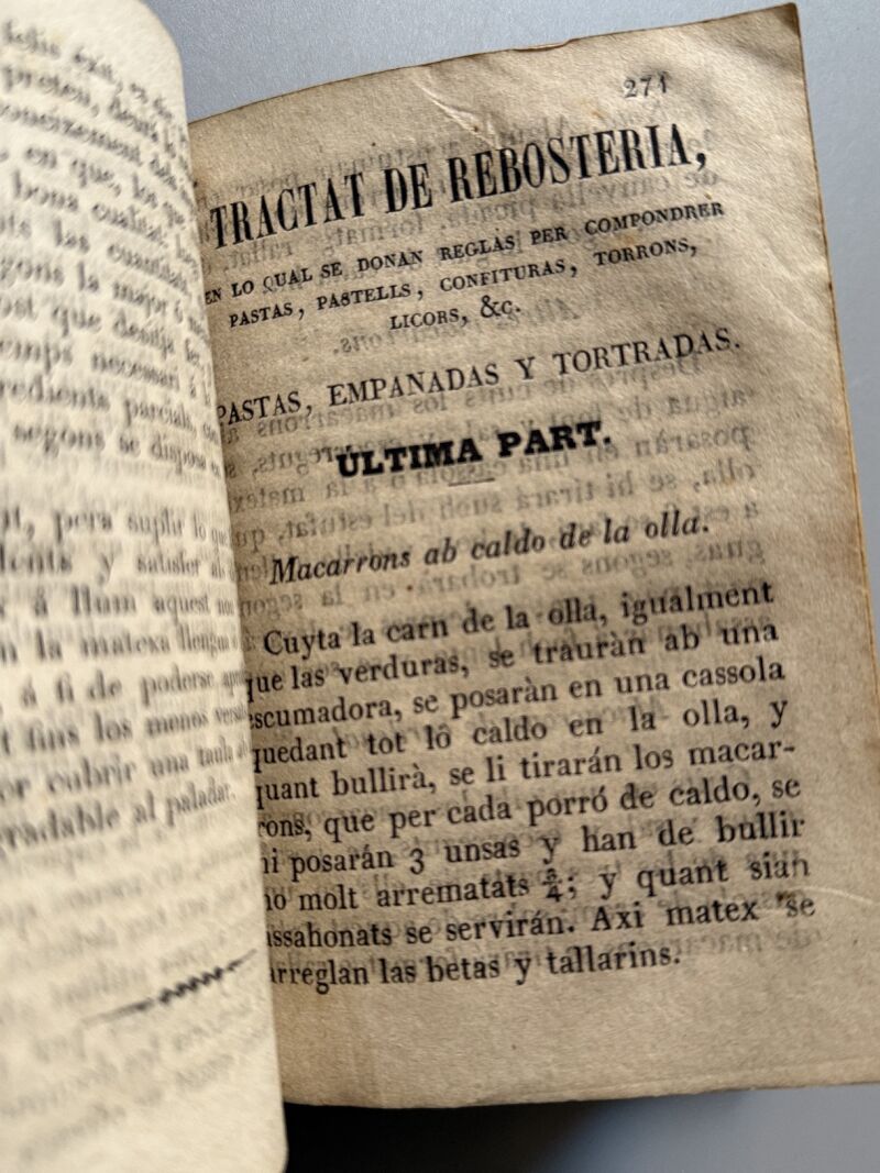 Observaciones: "Reglas útils, facils, seguras y economicas per cuynar bé. Escullidas dels autors que millor han escrit sobre aquesta materia". Dividido en cuatro partes. Grabado en el frontis. Encuadernación holandesa. Medidas: 14,5 x 10,5cm. Editado en Barcelona, ca. 1870..