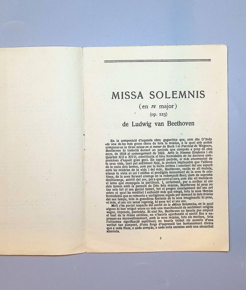 Observaciones: Folleto del Palau de la Música Catalana. Commemoració del centenari de la mort de Beethoven per l'Orfeó Català. Unica audició extraordinaria de la Missa Solemnis. 18 de junio de 1927. Medidas: 19 cm x 13,5 cm.