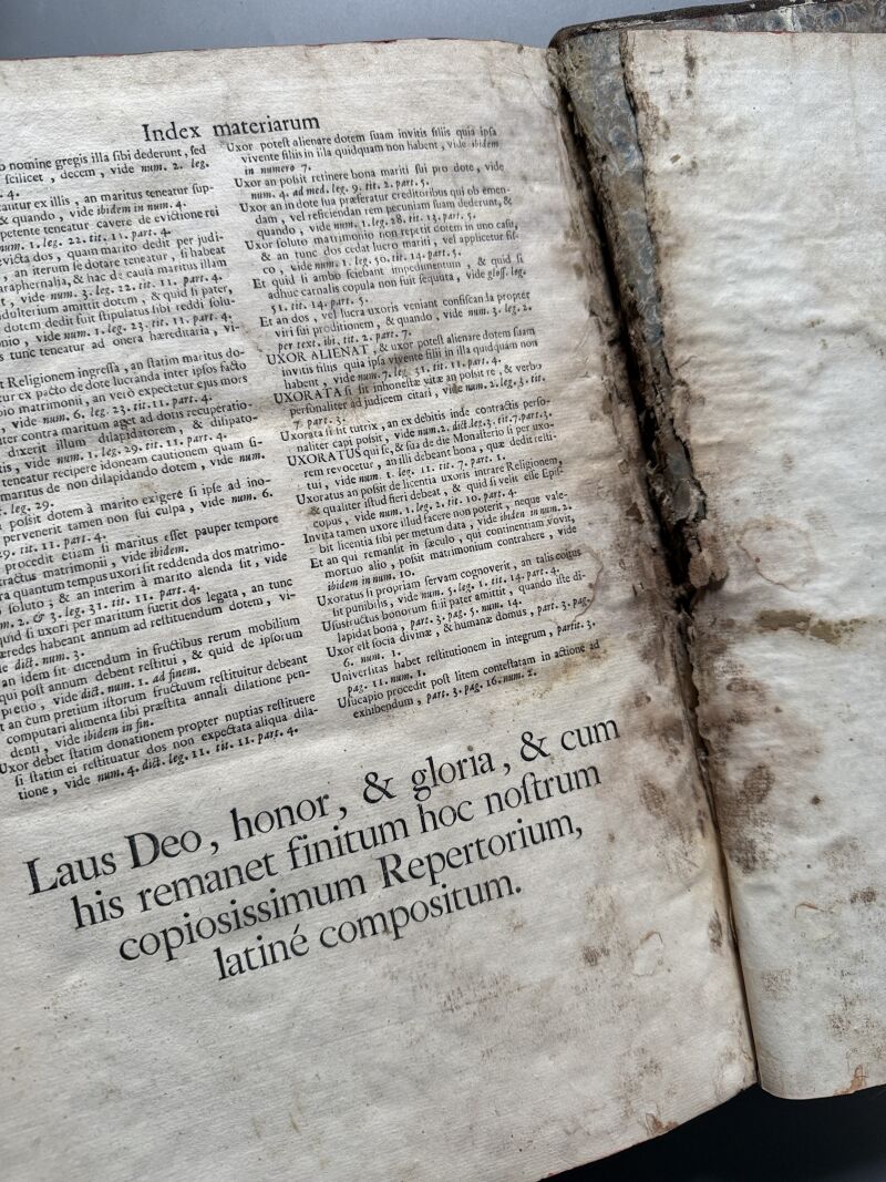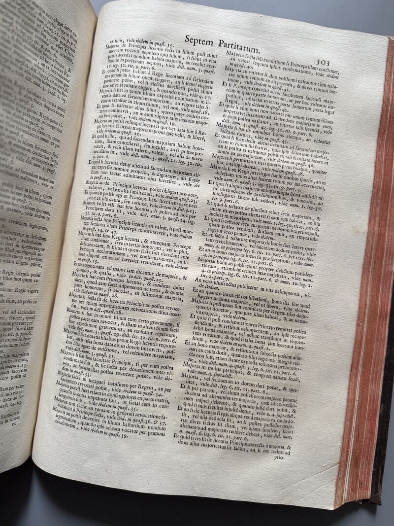 Observaciones: "Las siete partidas del rey D. Alfonso el Sabio glossadas por el Sr D. Gregorio Lopez...". Portada interior de la primera partida a dos tintas. Dos árboles genealógicos con retratos en la cuarta partida. Letras capitales y cabeceras ilustradas. Falta la portada interior de la quinta partida. Rotura en la esquina superior de la página 37 (afecta a una pequeña parte del texto). Rotura en la esquina superior de la pág. 31 de la segunda partida (no afecta al texto). Pequeña mancha de humedad en el margen derecho de las páginas 257 a 270 del tercer tomo. últimas páginas del índice afectadas por humedad (ver imágenes). En cinco volúmenes. Encuadernado en pasta española, nervios en el lomo. Cortes tintados. Algunas páginas tostadas y manchas de óxido Tomo I: 8 + índice + 356 + índice + 280/ Tomo II: índice + 436/ Tomo III: índice + 175 + índice + 270/ Tomo 4: índice + 285 + índice + 251/ índice: 164 + 548. Medidas: 35,5 x 25cm..