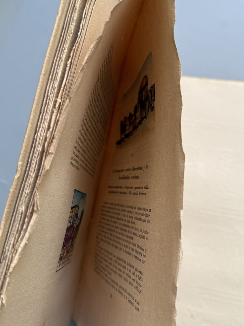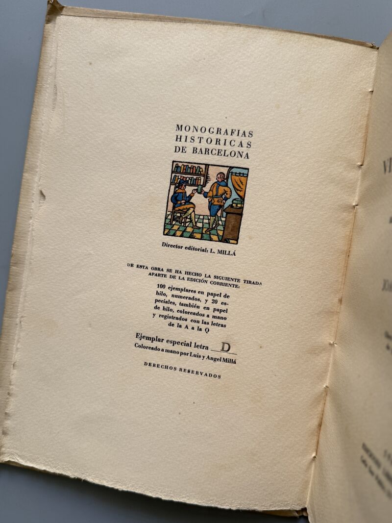 Observaciones: Ejemplar especial letra D. Un ejemplar de los 20 realizados en papel de hilo y coloreados a mano. Reseña historico-anecdótica. Nº18 de la colección Monografías históricas de Barcelona. Medidas: 25,5 x 18cm. Editado en Barcelona..