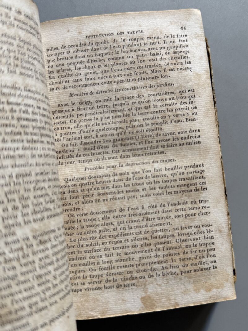 Observaciones: "L'art de cultiver les jardins ou Nouveau manuel complet des jardiniers". Contiene 5 grabados desplegables. Encuadernación holandesa. Medidas: 14,5 x 9,5cm. Editado en Paris, ca. 1835..