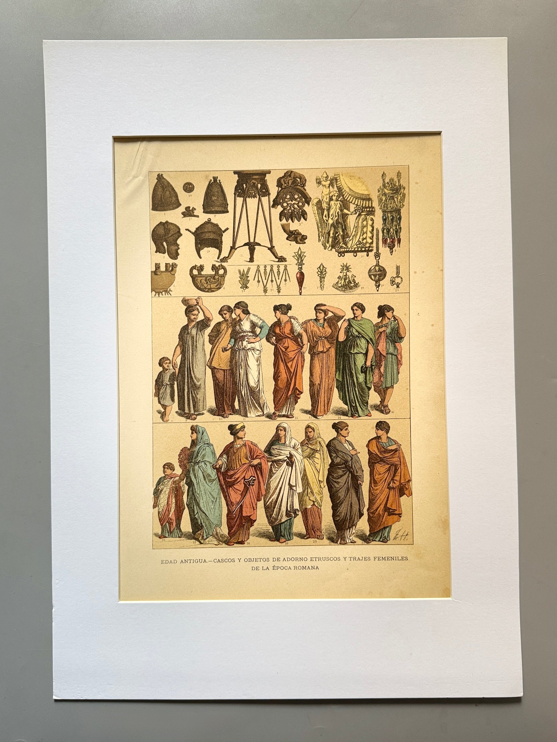 Cromolitografía de temática histórica. Edad antigua: Cascos y objetos de adorno estruscos y trajes femeniles de la época romana. Procedente de la obra "Historia del traje" editada por Montaner y Simón a finales del siglo XIX. Incluye paspartú, A3.