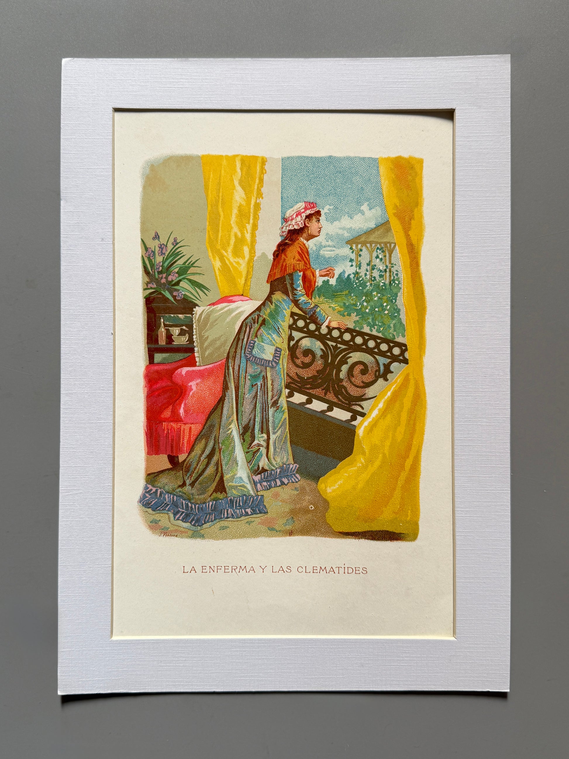 La enferma y las clematídes. Cromolitografía procedente de la obra "La vida de las flores" editada por Tipo-litografía Verdaguer en 1878. Incluye Paspartú, A4.
