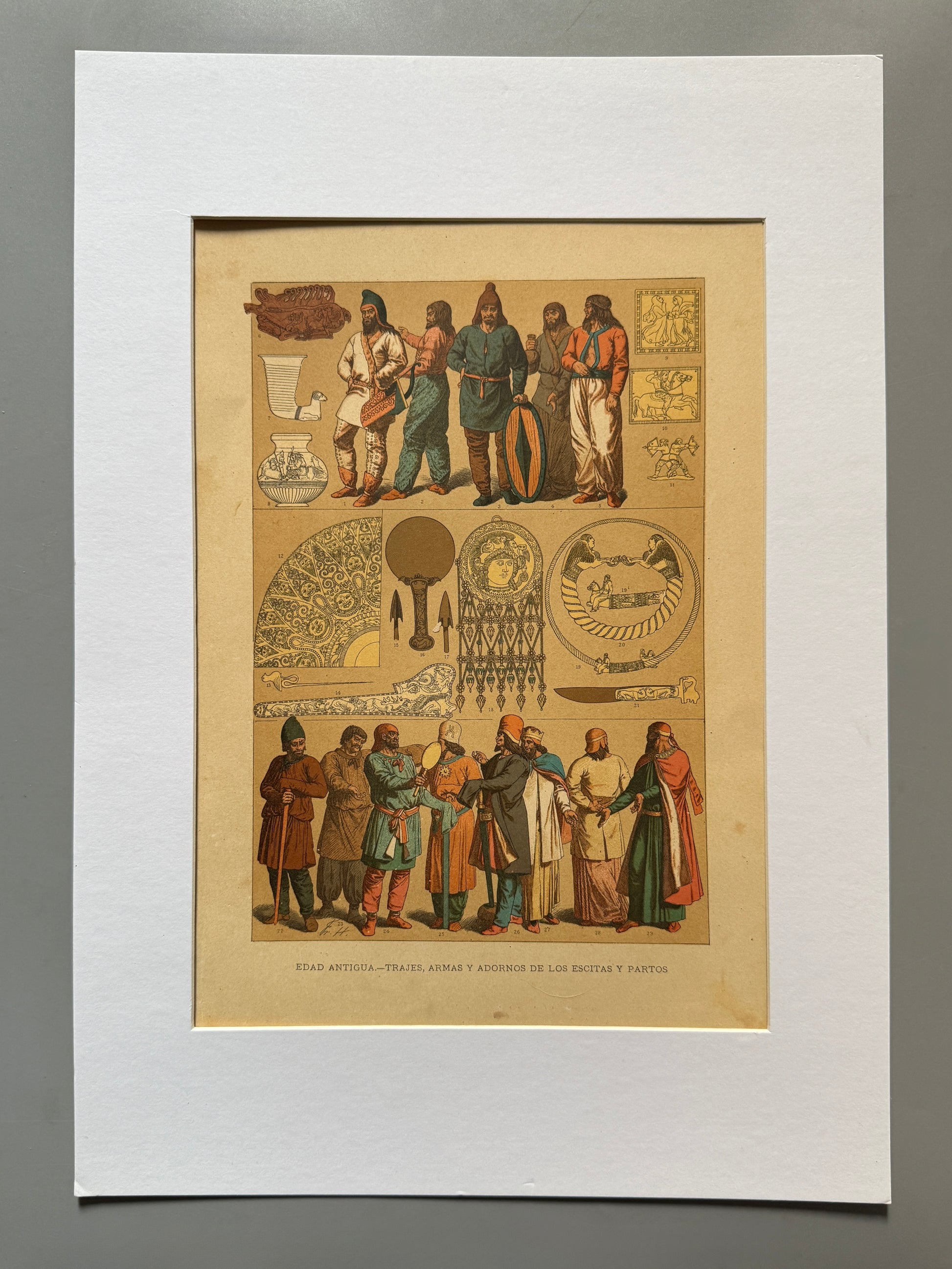 Cromolitografía de temática histórica. Edad antigua: trajes, armas y adornos de los Escitas y Partos. Conserva lámina explicativa. Procedente de la obra "Historia del traje" editada por Montaner y Simón a finales del siglo XIX. Incluye paspartú, A3.