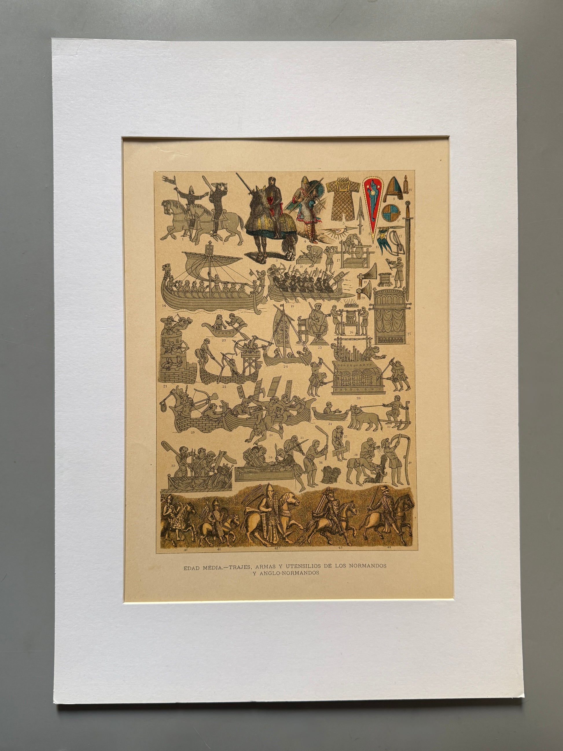 Cromolitografía de temática histórica. Edad media: trajes, armas y utensilios de los normandos y anglo-normandos. Conserva lámina explicativa. Procedente de la obra "Historia general del arte" editada por Montaner y Simón a finales del siglo XIX. Incluye paspartú, A3.
