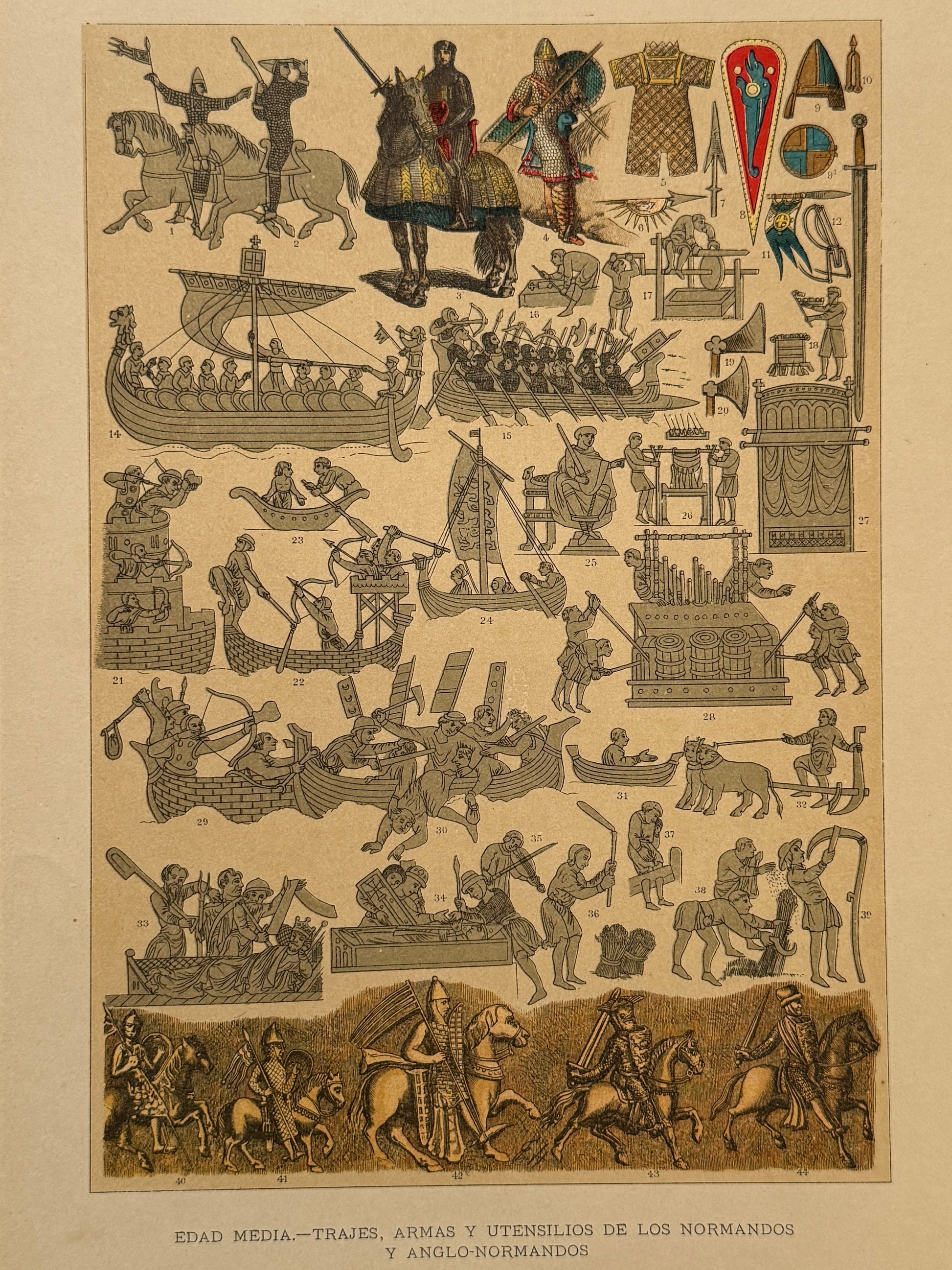 Cromolitografía trajes, armas y utensilios de los normandos y anglo-normandos - Historia general del arte. Montaner y Simón ca. 1890