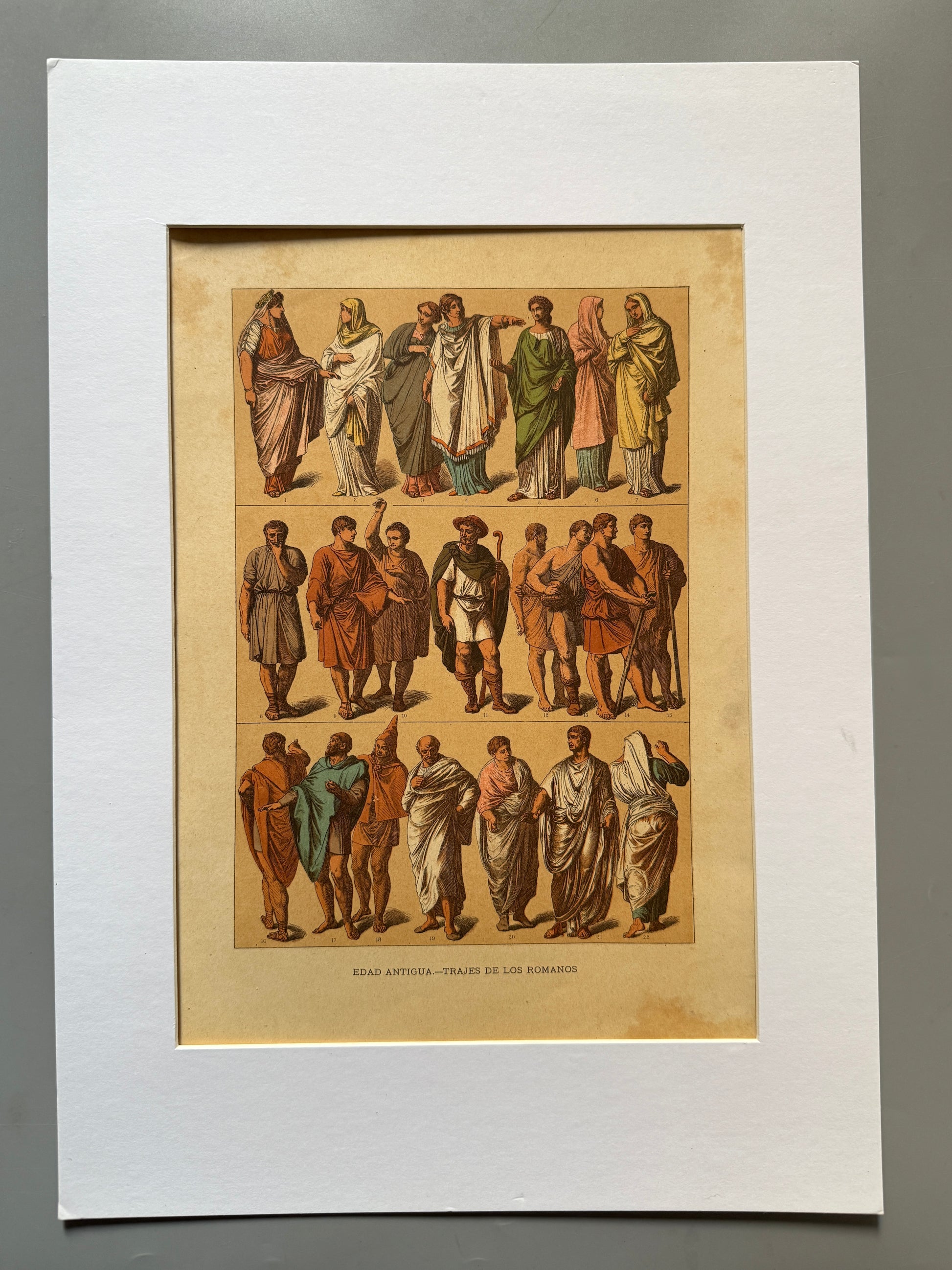 Cromolitografía de temática histórica. Edad antigua: trajes de los romanos. Conserva lámina explicativa. Procedente de la obra "Historia general del arte" editada por Montaner y Simón a finales del siglo XIX. Incluye paspartú, A3.