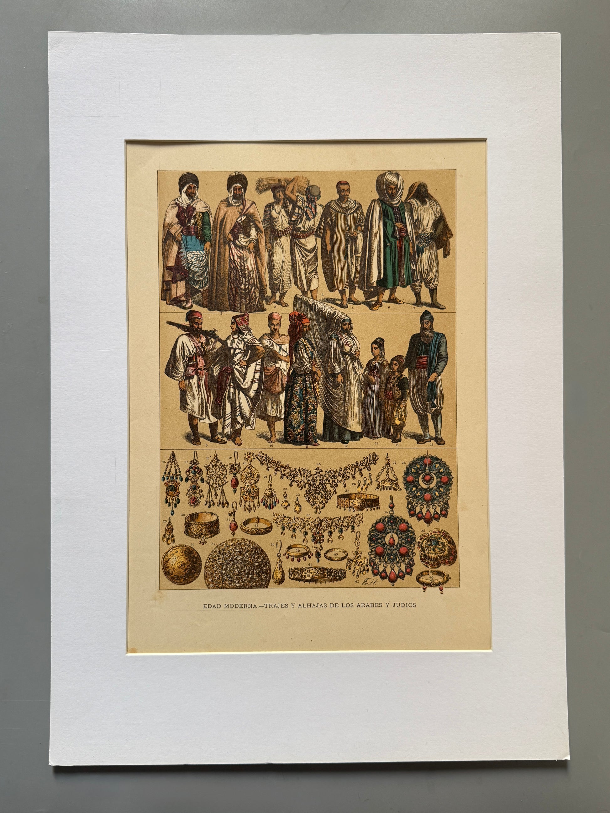 Cromolitografía de temática histórica. Edad moderna: trajes y alhajas de los árabes y judios. Conserva lámina explicativa. Procedente de la obra "Historia general del arte" editada por Montaner y Simón a finales del siglo XIX. Incluye paspartú, A3.