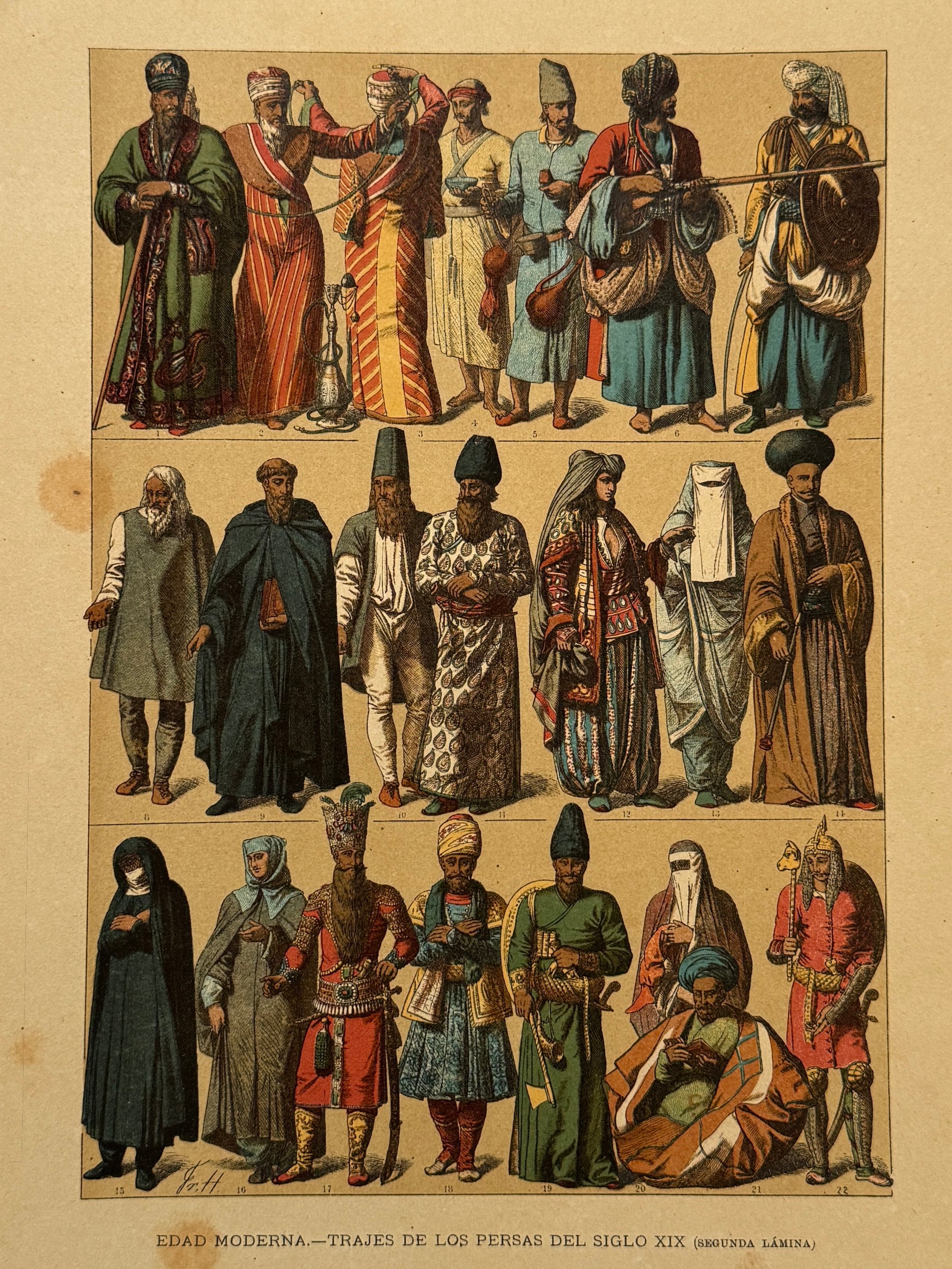 Cromolitografía de temática histórica. Edad moderna: trajes y armas de los persas del siglo XIX. Conserva lámina explicativa. Procedente de la obra "Historia general del arte" editada por Montaner y Simón a finales del siglo XIX. Incluye paspartú, A3.