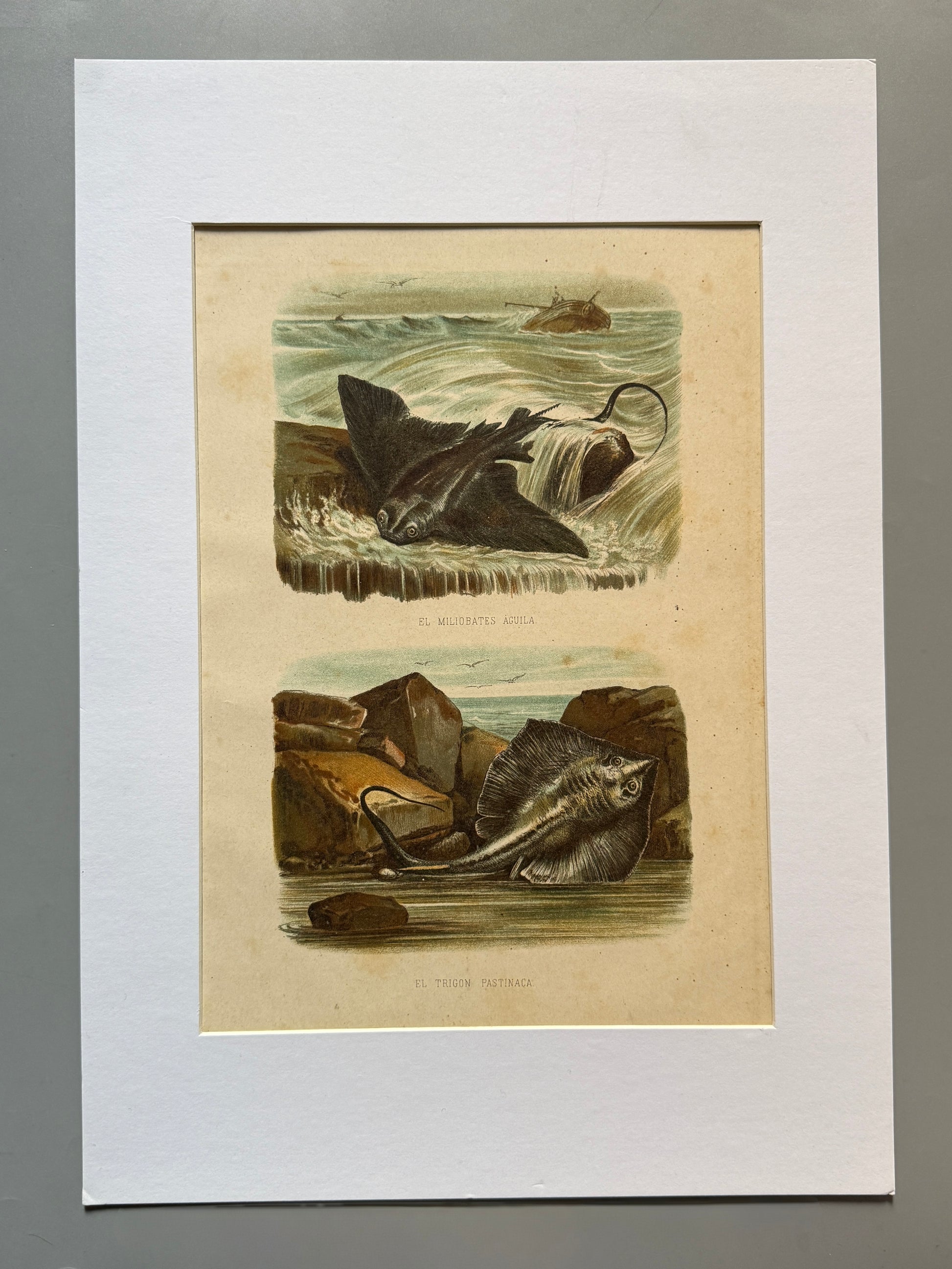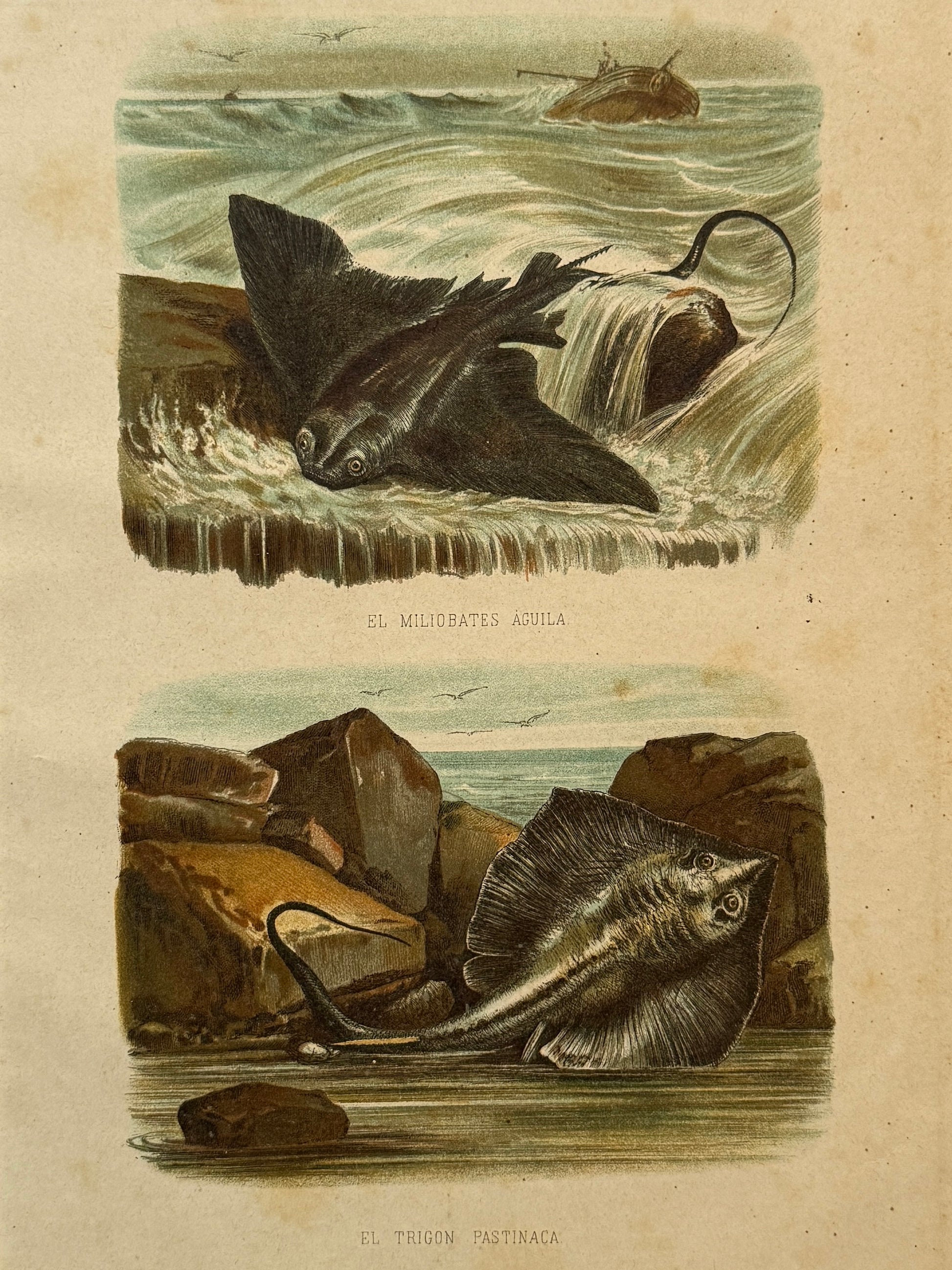 El Miliobates águila y el Trigon pastinaca. Cromolitografía procedente de la obra "Historia Natural" editada por Montaner y Simón en 1876. Incluye Paspartú, A3.