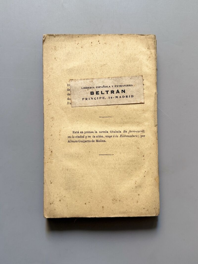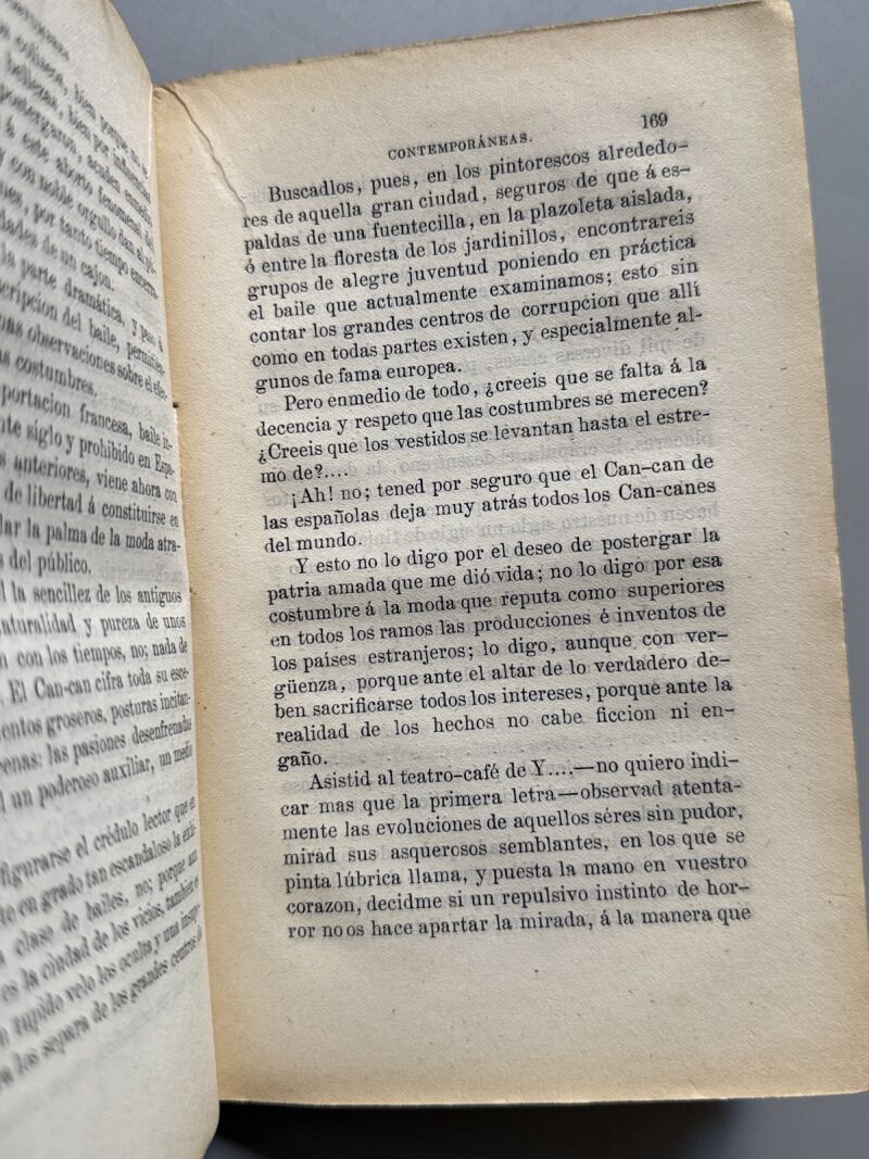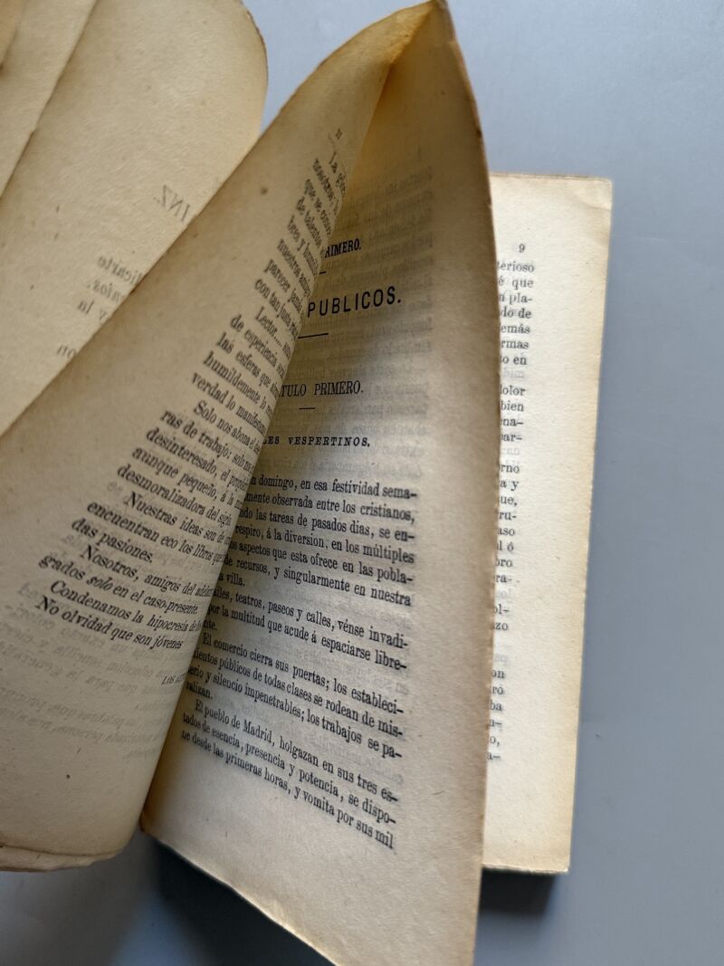 Observaciones: Costumbres contemporáneas. Bailes públicos, reuniones políticas, el teatro y el teatro-café, paseos públicos y costumbres populares. Encuadernación rústica. Medidas: 18 x 11cm. Editado en Madrid..