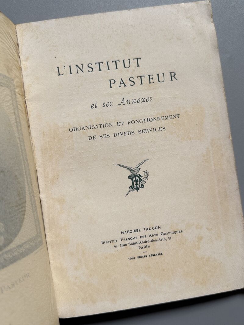Observaciones: "Organisation et fonctionnement de ses divers services". Organización y funcionamiento del Instituto Pasteur. Ilustrado. Medidas: 18 x 12cm. Editado en Paris, ca. 1895..