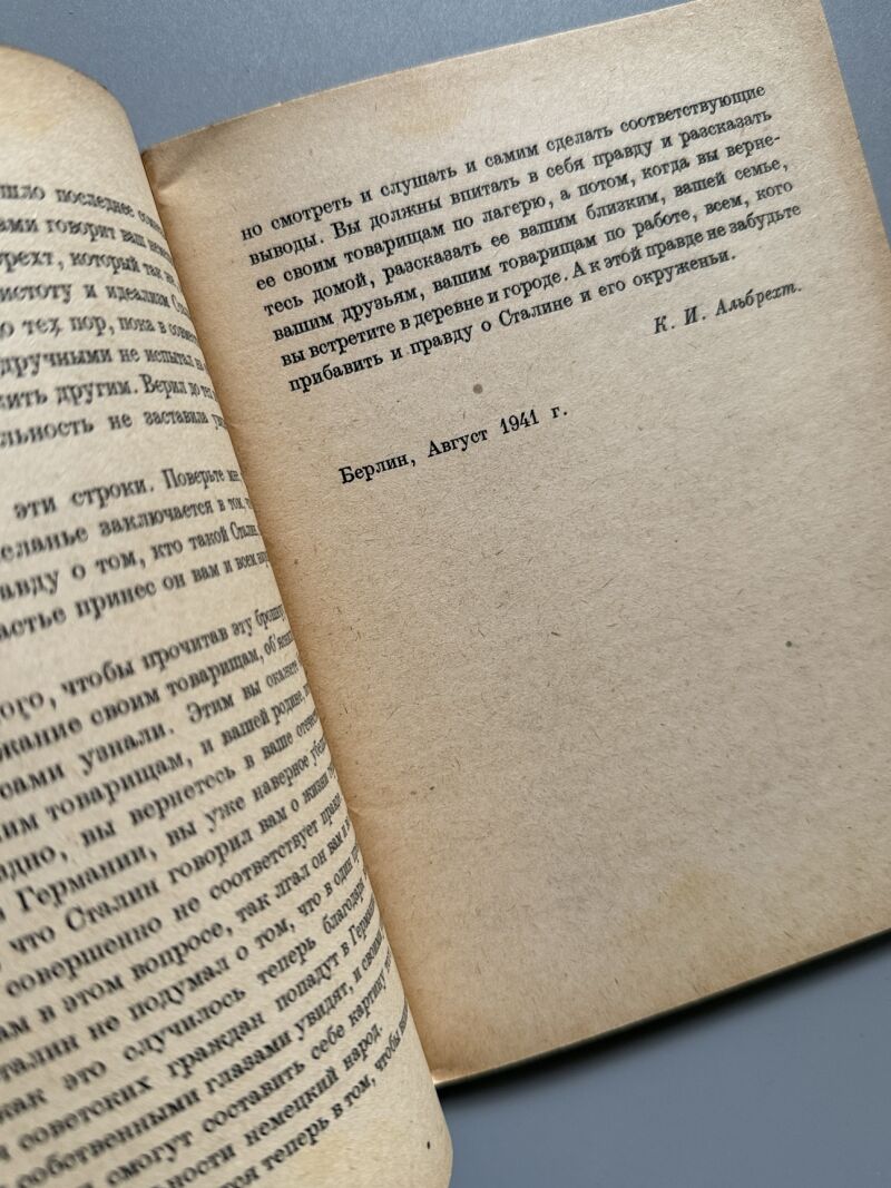 Observaciones: Libro de propaganda nazi anticomunista escrito en Ruso. Se editó en Berlín en 1941 para ser distribuido en las zonas de ocupación nazi que pertenecían a la Unión Soviética. Desacredita a Stalin y a su gobierno. Contiene fotografías. Su autor fue un ex-comunista alemán que viajó a la Rusia soviética en los años 20, consiguió convertirse en un funcionario de alto rango. Fue acusado de espía y volvió a Alemania donde se afilió al partido nazi. Comenzó a trabajar para el ministro de propaganda Joseph Goebbles. Es posible que se trate de una segunda edición ampliada aunque no hay mucha información al respecto. Contiene fotografías. Medidas: 17 x 13,5cm. Encuadernación rústica..