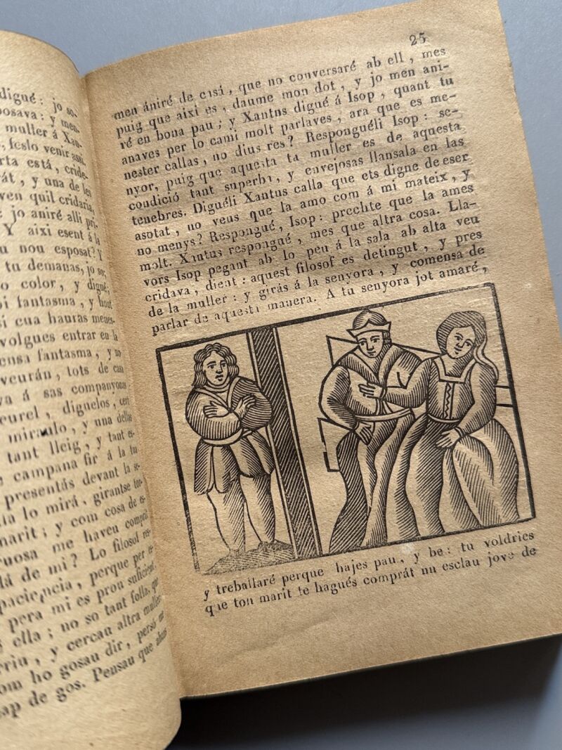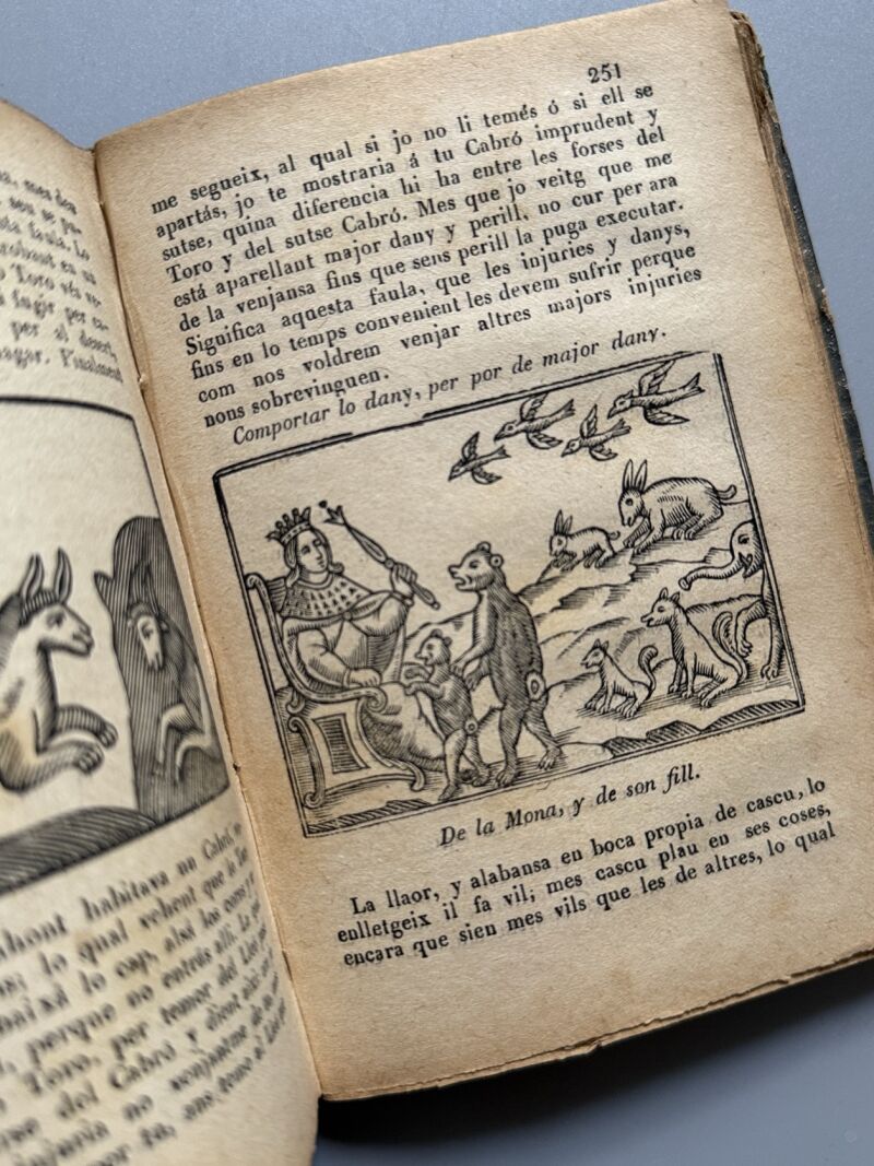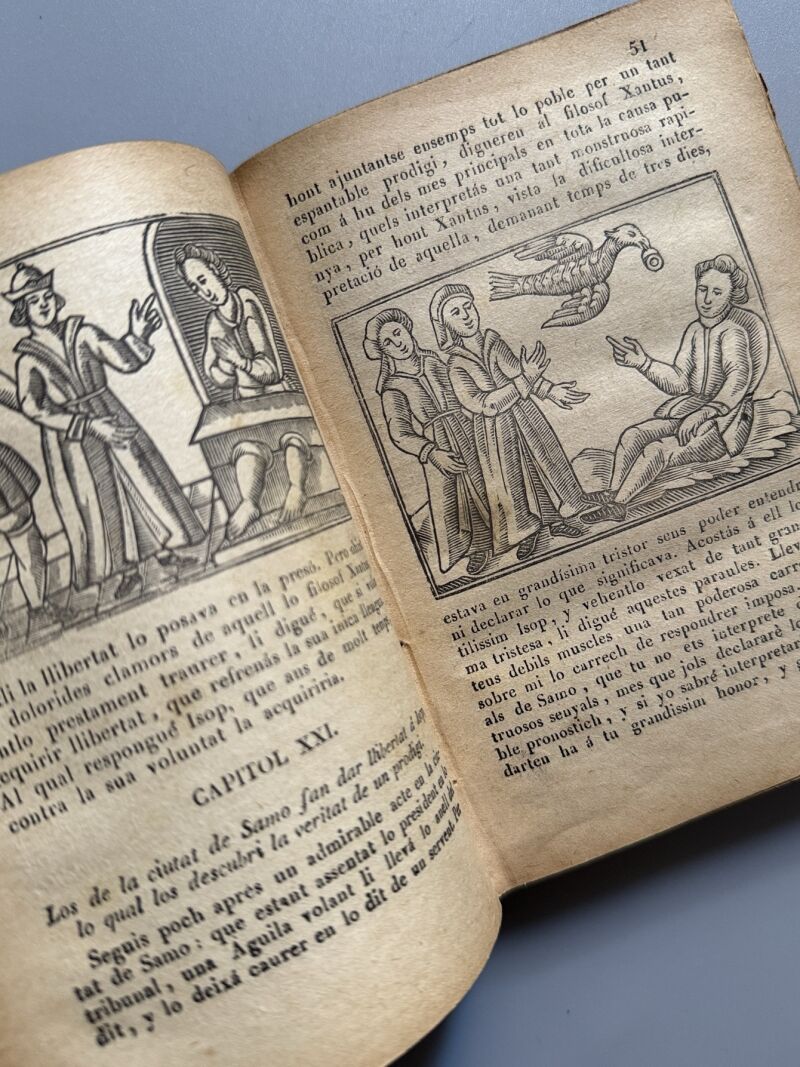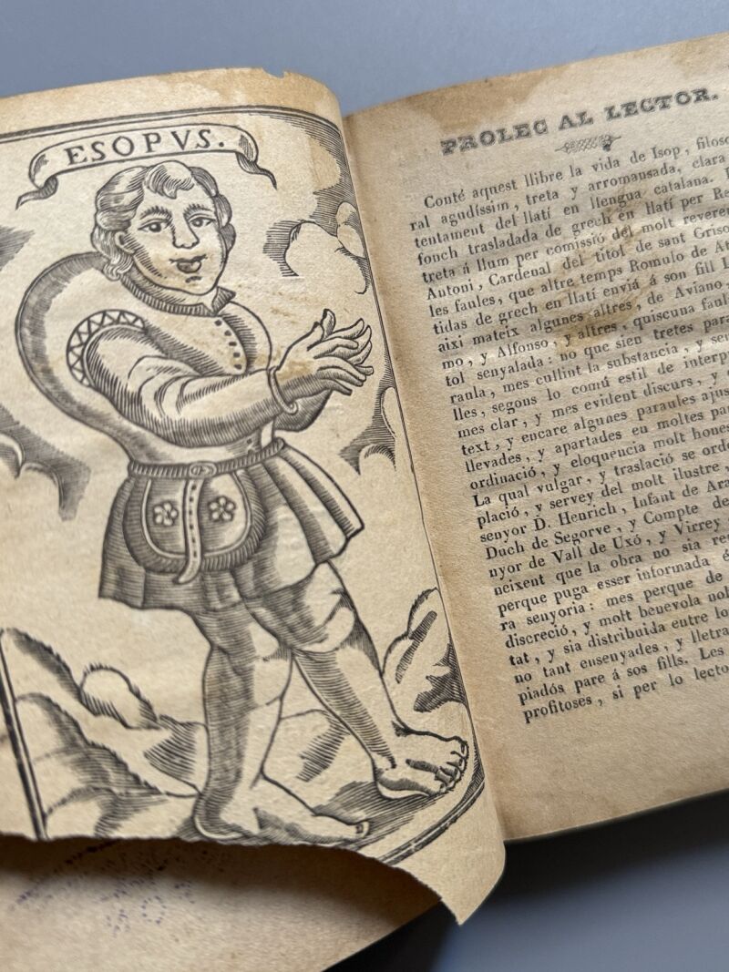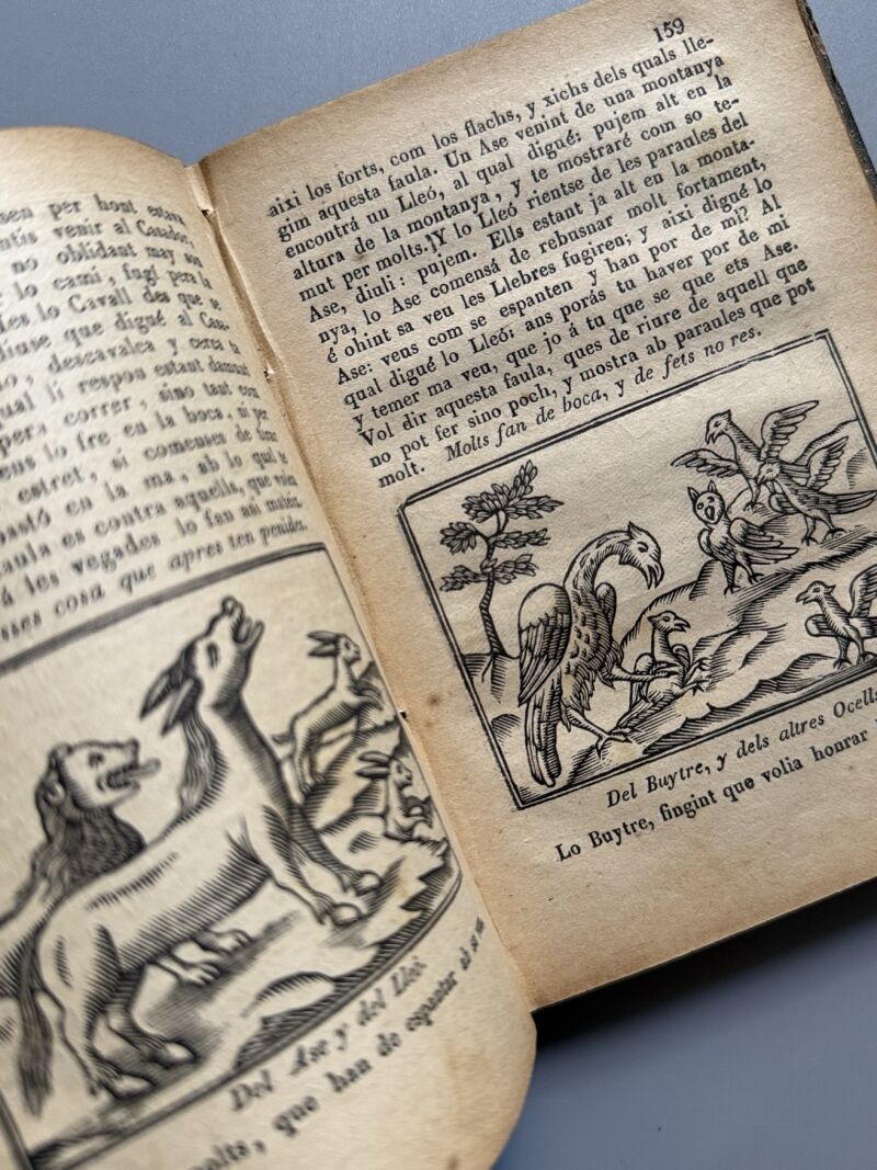 Observaciones: "Faules de Isop, filosof moral y de altres famosos autors". Ilustrado con numerosos grabados. Encuadernación holandesa. Medidas: 15 x 10,5cm. Editado en San Gervasi..