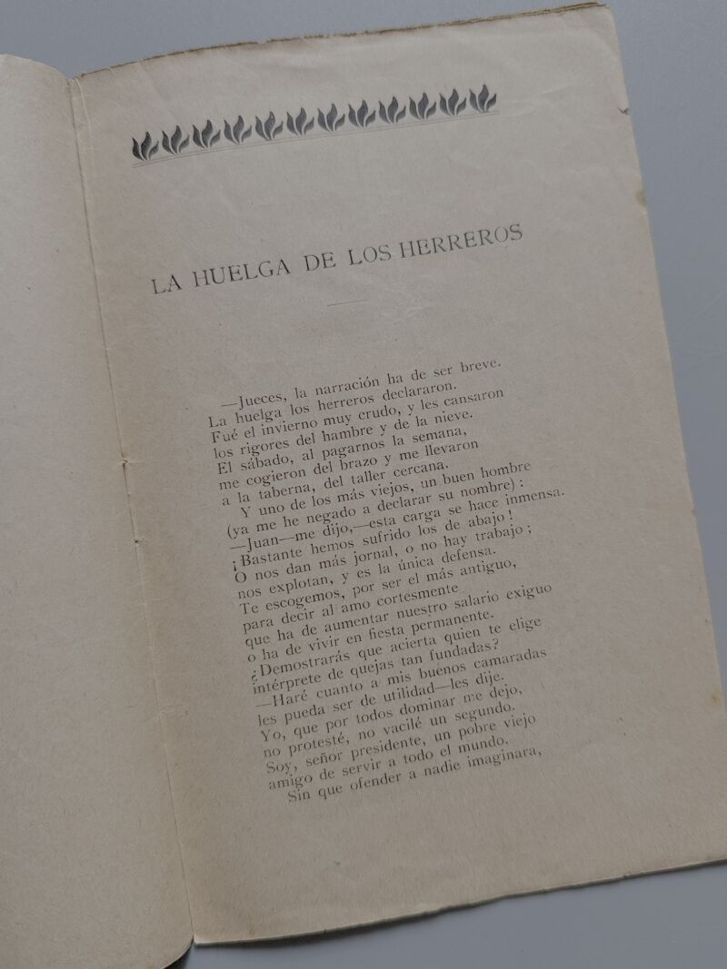 Observaciones: Traducción del poema de Coppée "La grëve des forgerons". Monólogo en verso. Medidas: 18,5 x 12cm. Editado en Madrid/ Barcelona..