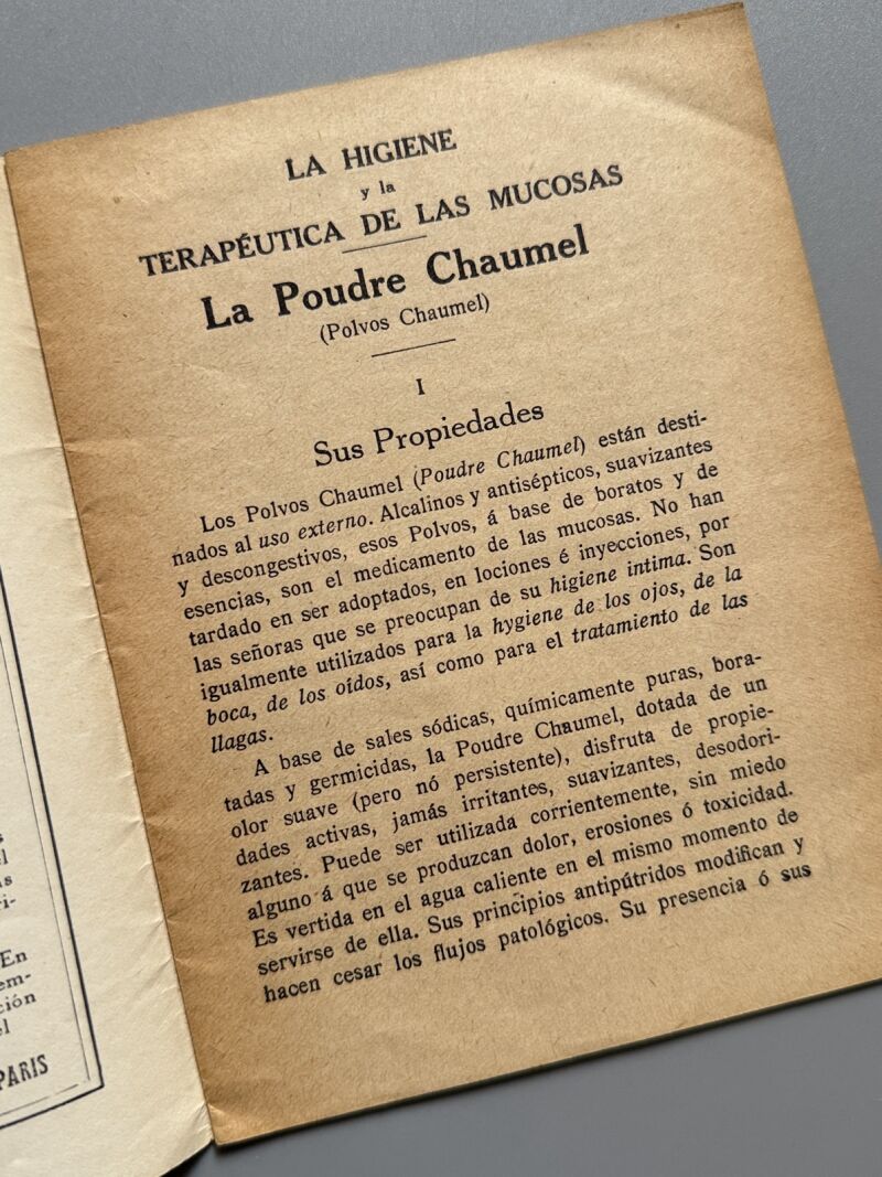 Observaciones: Pequeño folleto sobre higiene y medicina usuales editado por la marca La Poudre Chaumel. Publicidad en el interior. Medidas: 15,5 x 12cm. Editado en Paris..