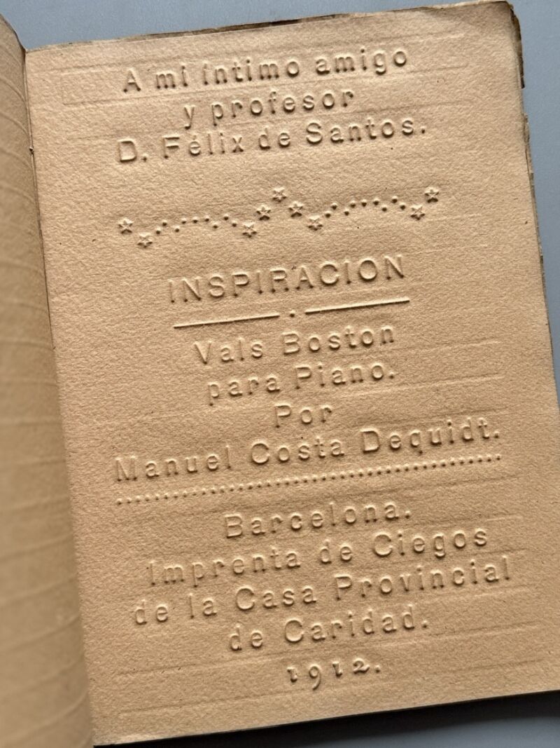 Observaciones: Inspiración. Programa de Vals Boston para Piano compuesto por Manuel Costa Dequidt. Se lo dedicó a su íntimo amigo y profesor D. Félix de Santos. Este era ciego de manera que se publicó en braile por la Imprenta de Ciegos de la Casa Provincial de Caridad de Barcelona. Encuadernación rústica. Medidas: 22 x 16cm..