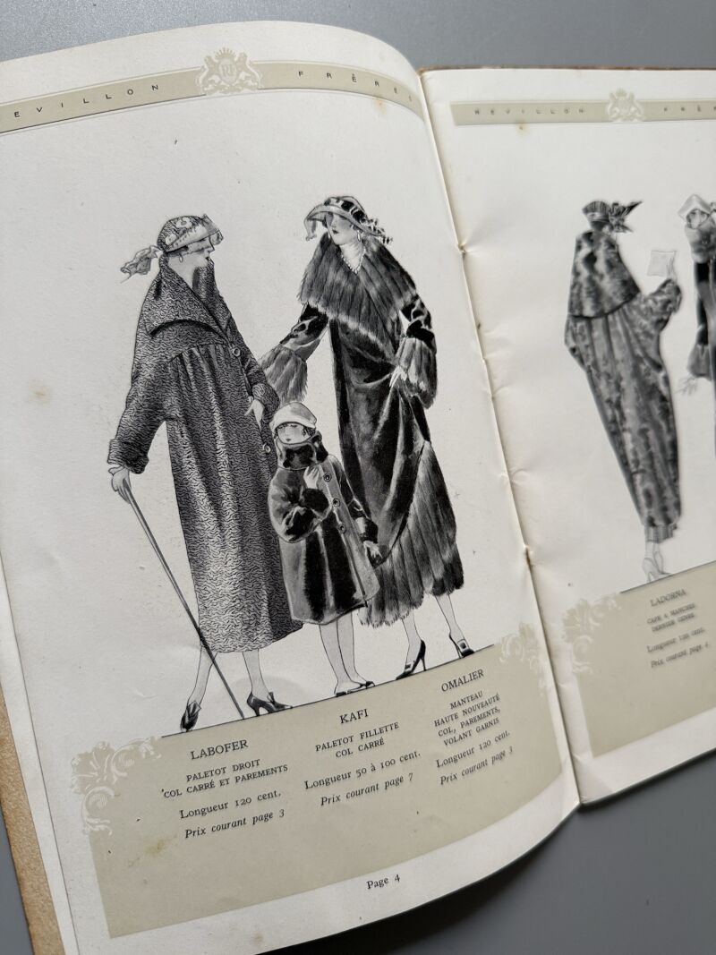 Observaciones: Catálogo de la peletería Revillon Frères, casa fundada en 1723. Contiene gran cantidad de diseños. Temporada 1921-1922. Medidas: 24 x 15,5cm. Editado en Paris..