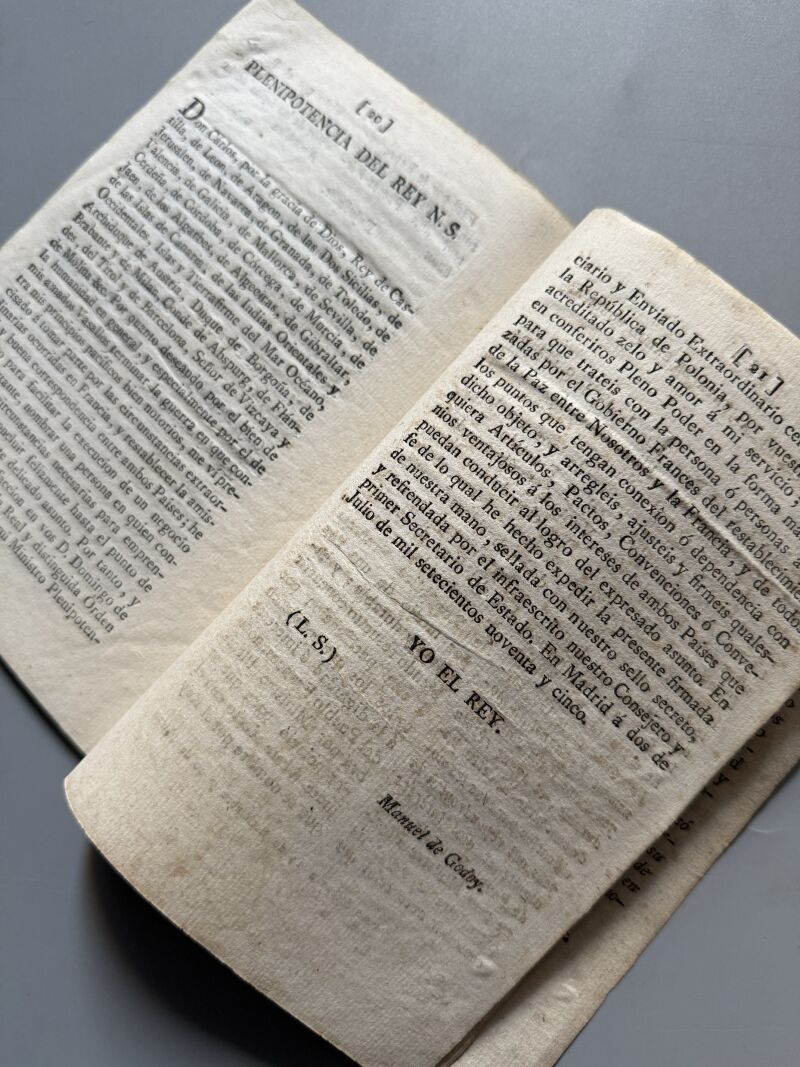 Observaciones: Tratado definitivo de paz concluido entre el rey nuestro señor y la república francesa firmado en Basilea á 22 de julio de 1795. Medidas: 19,5 x 14cm..