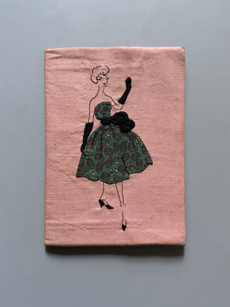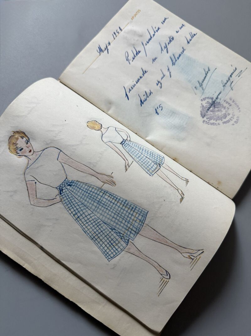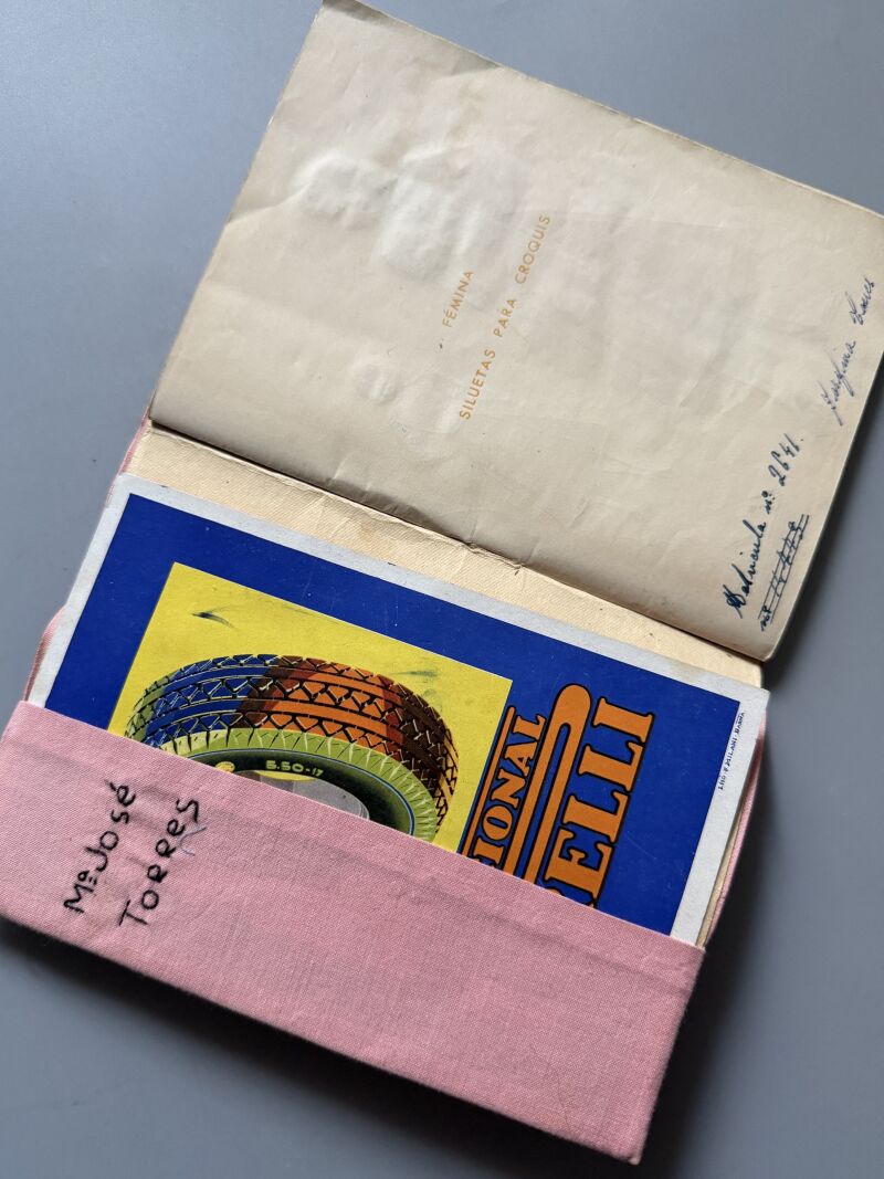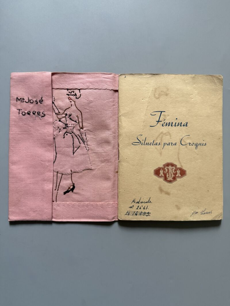 Observaciones: Curso de moda de los años 50. Contiene 3, desde 1956 hasta 1959. Sobrecubierta única, bordada, realizada por la alumna del curso, Mª José Torres. Nombre bordado en el interior. Figurines con su descripción, fecha de realización, nota del ejercicio, firma de la profesora y sello del centro: Escuela Profesional para la Mujer. Contiene 22 figurines. Uno de ellos contiene un pedacito de tela con el que se confeccionaría un vestido. Páginas en blanco al final de la libreta. Papel secante de la marca Pirelli..