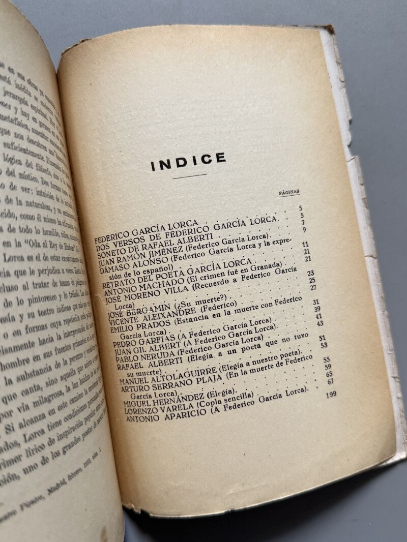 Observaciones: Homenaje a Federico García Lorca tras su muerte. Colaboran diversos autores reconocidos: Antonio Machado, José Moreno Villa, Emilio Prados, José Bergamín, Dámaso Alonso, Vicente Aleixandre, Pedro, Garfias, Juan Gil Albert, Pablo Neruda, Rafael Alberti, Manuel Altolaguirre, Arturo Serrano Plaja, Miguel Hernández, Lorenzo Varela y Antonio Aparicio. Contiene una selección de sus obras (poemas, prosas, teatro, música, dibujos) realizada por Emilio Prados. Contiene fotografías de Lorca. Forma parte de la colección de Libros antifascistas. Editado durante la Guerra Civil en Valencia-Barcelona. Encuadernación rústica. Medidas: 19 x 14cm. Muy raro..