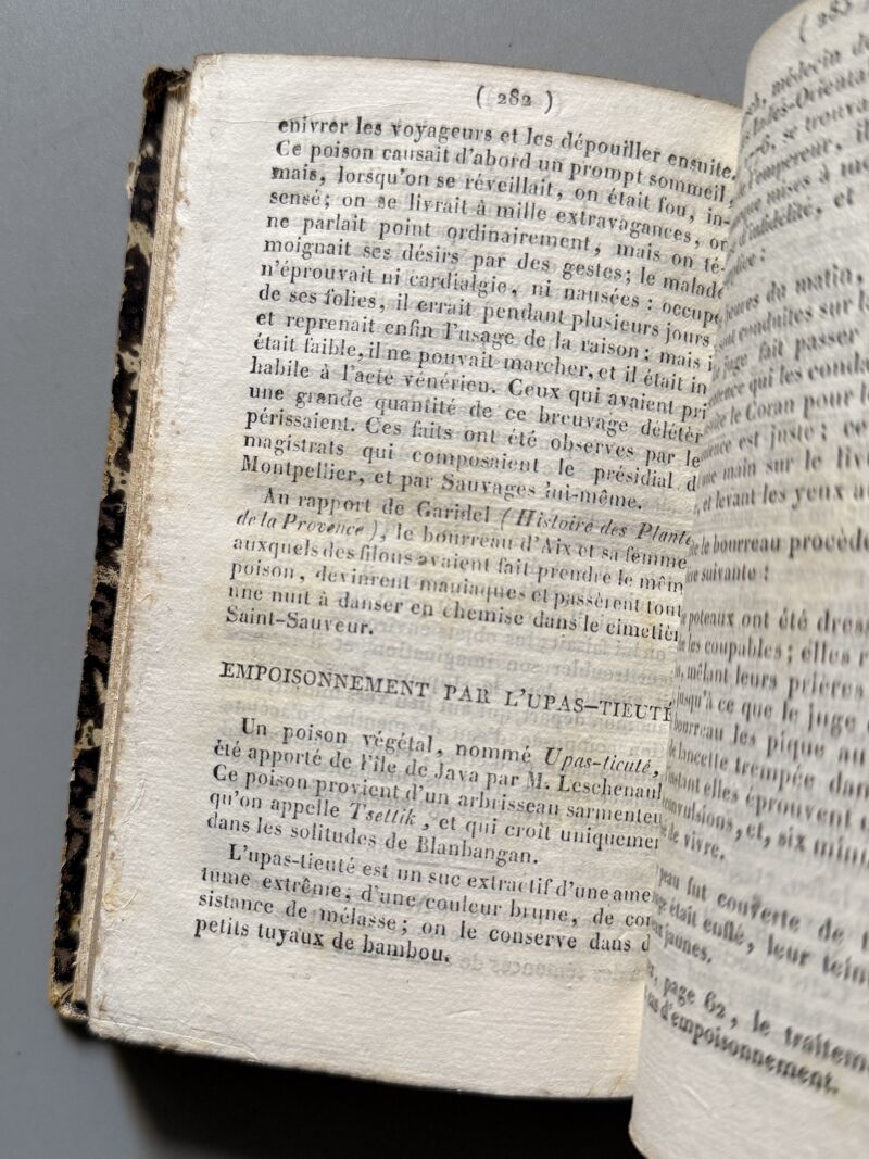 Observaciones: Manuel pratique des contre-poisons ou Traitement des individus empoisonnés, asphyxiés, noyés ou mordus par des animaux enragés et des serpens ou piqués par des insectes venimeux : suivi des moyens de rappeler la vie dans les cas de mort apparente. Manual práctico contra venenos. Contiene una lámina desplegable. Encuadernación holandesa. Medidas: 14,5 x 9,5cm. Editado en Paris..