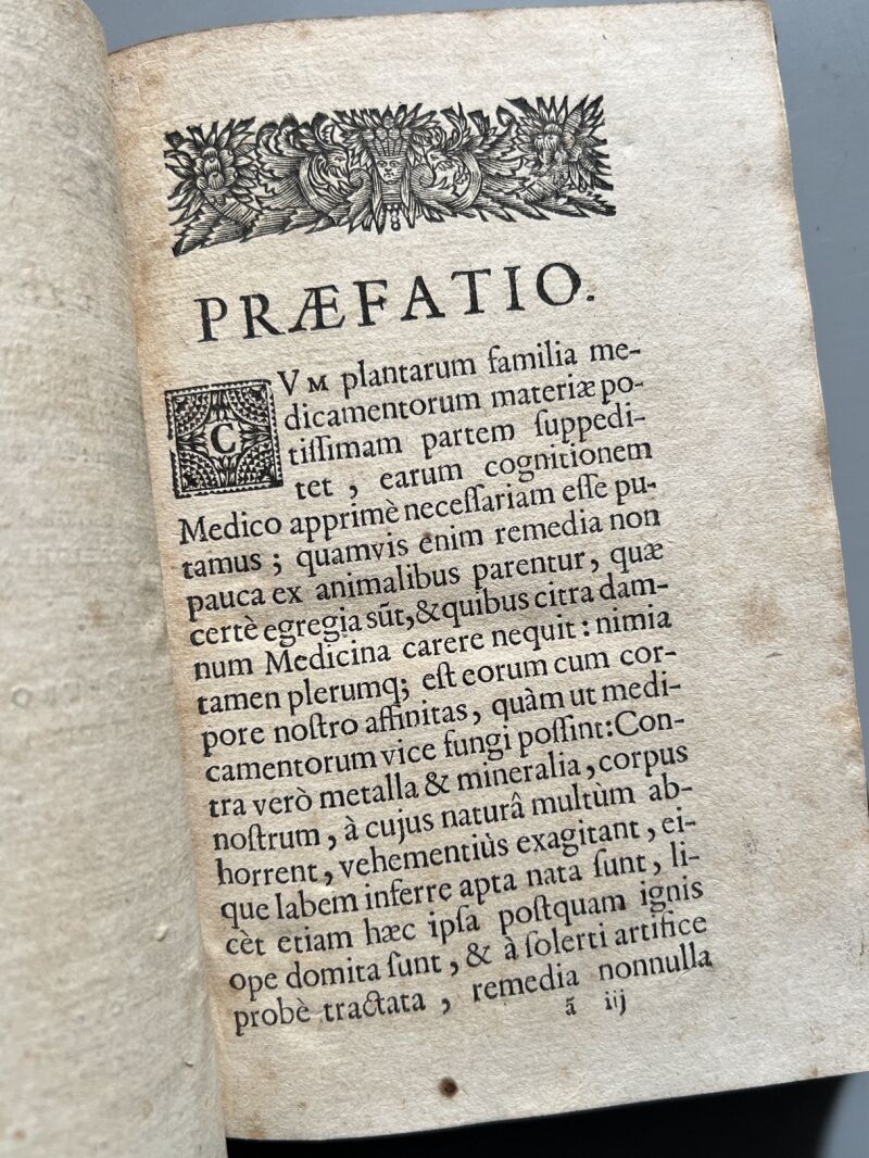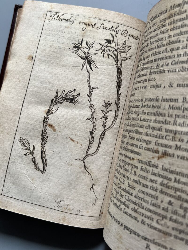 Imp. Lvgdvni : Ex officina Francisci Carteron. Impensis Francisci Bovrly, Bibliopolae Monspeliensis. Lugduni. 16,5 cm x 11,5 cm. 3h., 287 pág. 19 grabados calcográficos. intercalados de plantas y flores de los alrededores de Montpellier finamente y elegantemente grabados por Jean de Troy, artista de Montpellier, padre del pintor Jean-François de Troy. (En el ejemplar del Real Jardín Botánico hay solo 17 grabados). Falta apéndice final (de pag 287 a 309) .Reencuadernado en plena piel, nervios, tejuelo y dorados en el lomo. Hierros a ambos planos.