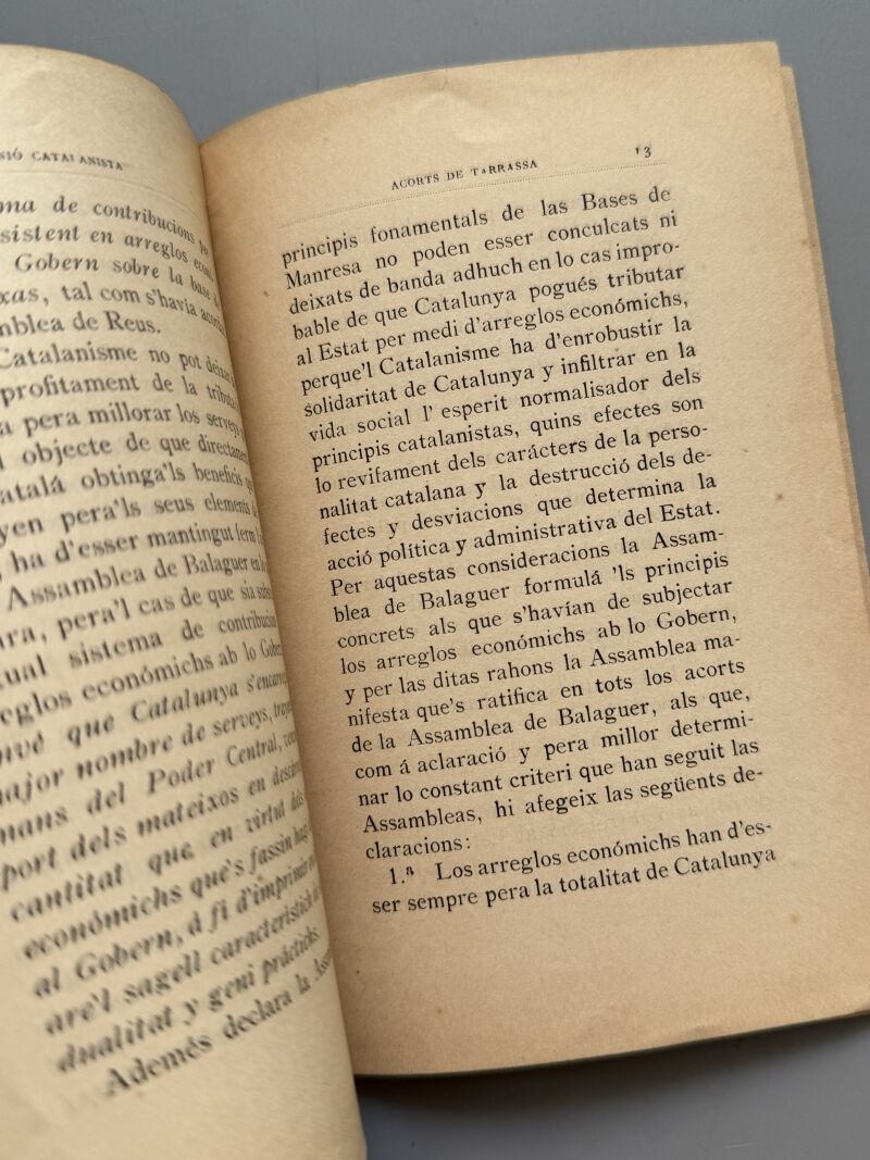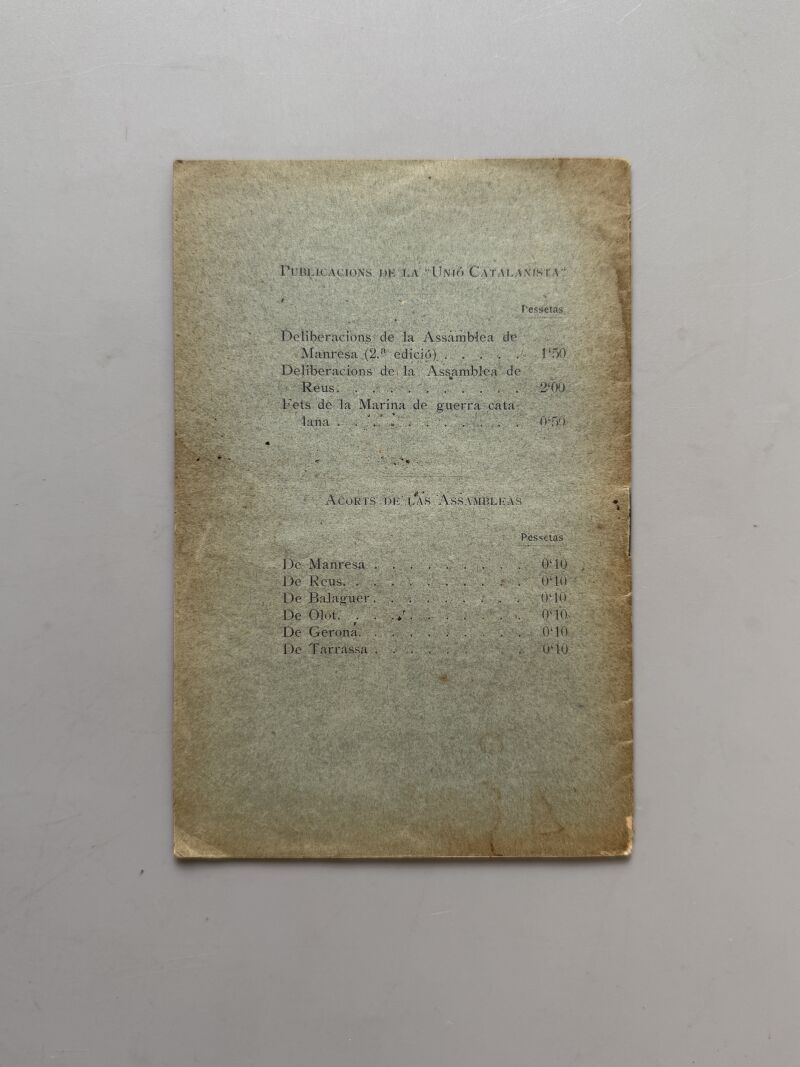 Observaciones: Assamblea General de Delegats tinguda a Tarrassa en los días 26 y 27 de maig de 1901. Encuardenación rústica. Medidas: 15,5 x 10cm. Editado en Barcelona..