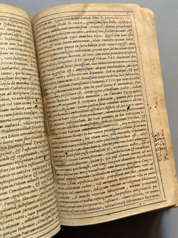Observaciones: . "Biblia sacra vulgatae editionis sixti quinti pont. max. iussu recognita atque edita". Marcas de bibliófagos en las primeras y las últimas páginas. Texto en latín a doble columna. Mancha de humedad en las partes superior e inferior hasta la página 183 aprox., y desde la 734 hasta el final. También en la parte inferior de las últimas páginas. p. 9-810, p. 1-44. Una de las páginas de difícil lectura, tipografía poco nítida. Reencuadernada en pasta española durante la primera mitad del siglo XIX. Medidas: 16,5 x 12cm. Editada en Lugduni (Lyon).