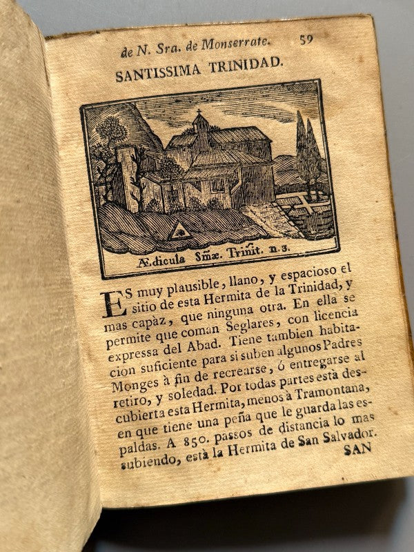 Observaciones: . "Compendio historial ó Relación breve y veridica del portentoso santuario, y cámara angelical de Nuestra Señora de Monserrate. Dirigido a los piadosos devotos afectos de aquellas personas, que desean verle, y no se les proporciona la fortuna de conseguirlo". Grabado frontis. Contiene 13 grabados de lugares de culto religioso. Anotaciones fechadas, primer tercio del siglo XIX y 1933. Reencuadernado, hojas de cortesía modernas. Encuadernación de época, pleno pergamino original. Medidas: 15 x 10,5cm. Editado en Barcelona, ca. 1790.