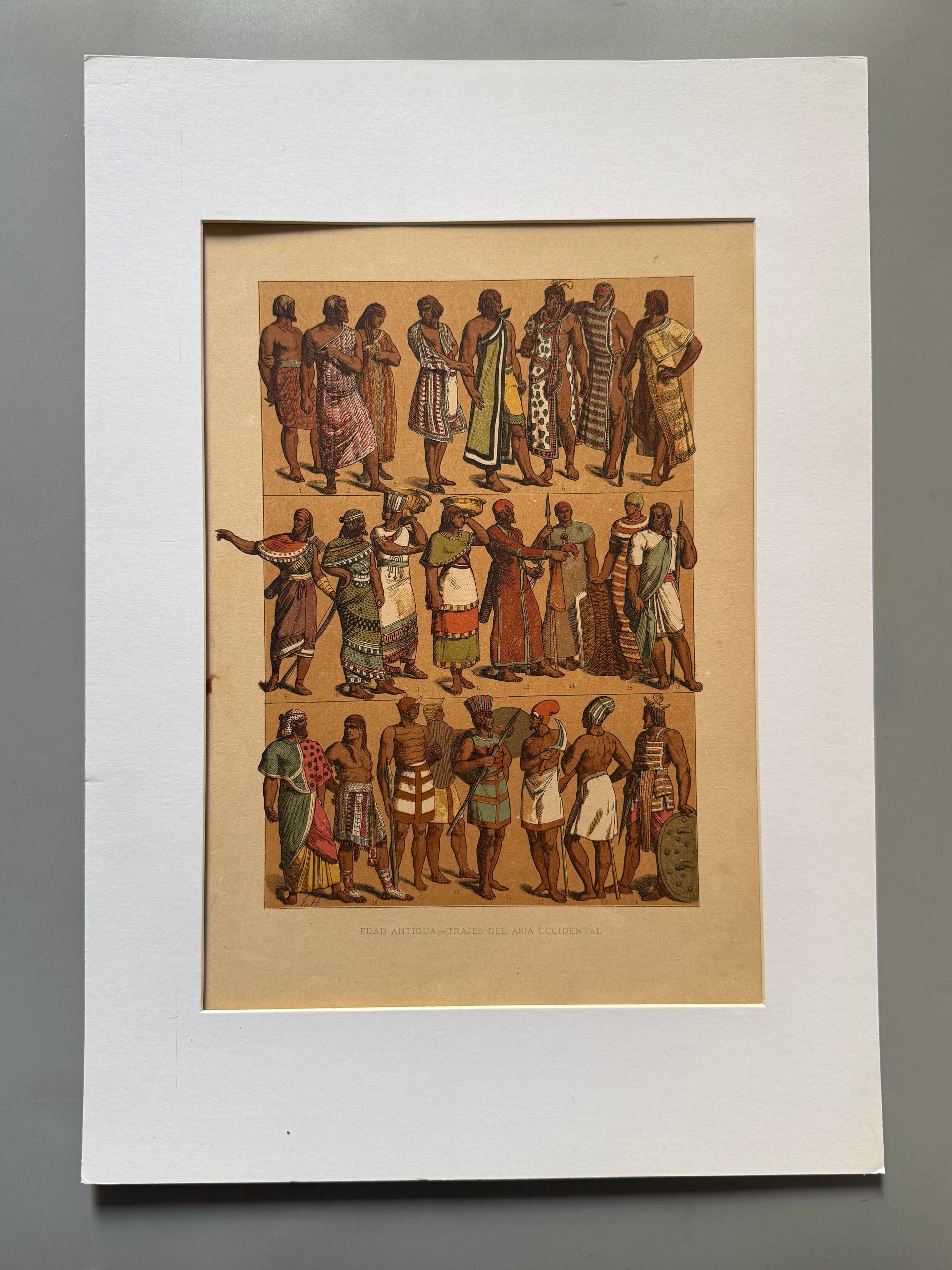Cromolitografía de temática histórica. Edad antigua: trajes del Asia occidental. Conserva lámina explicativa. Procedente de la obra "Historia general del arte" editada por Montaner y Simón a finales del siglo XIX. Incluye paspartú, A3.