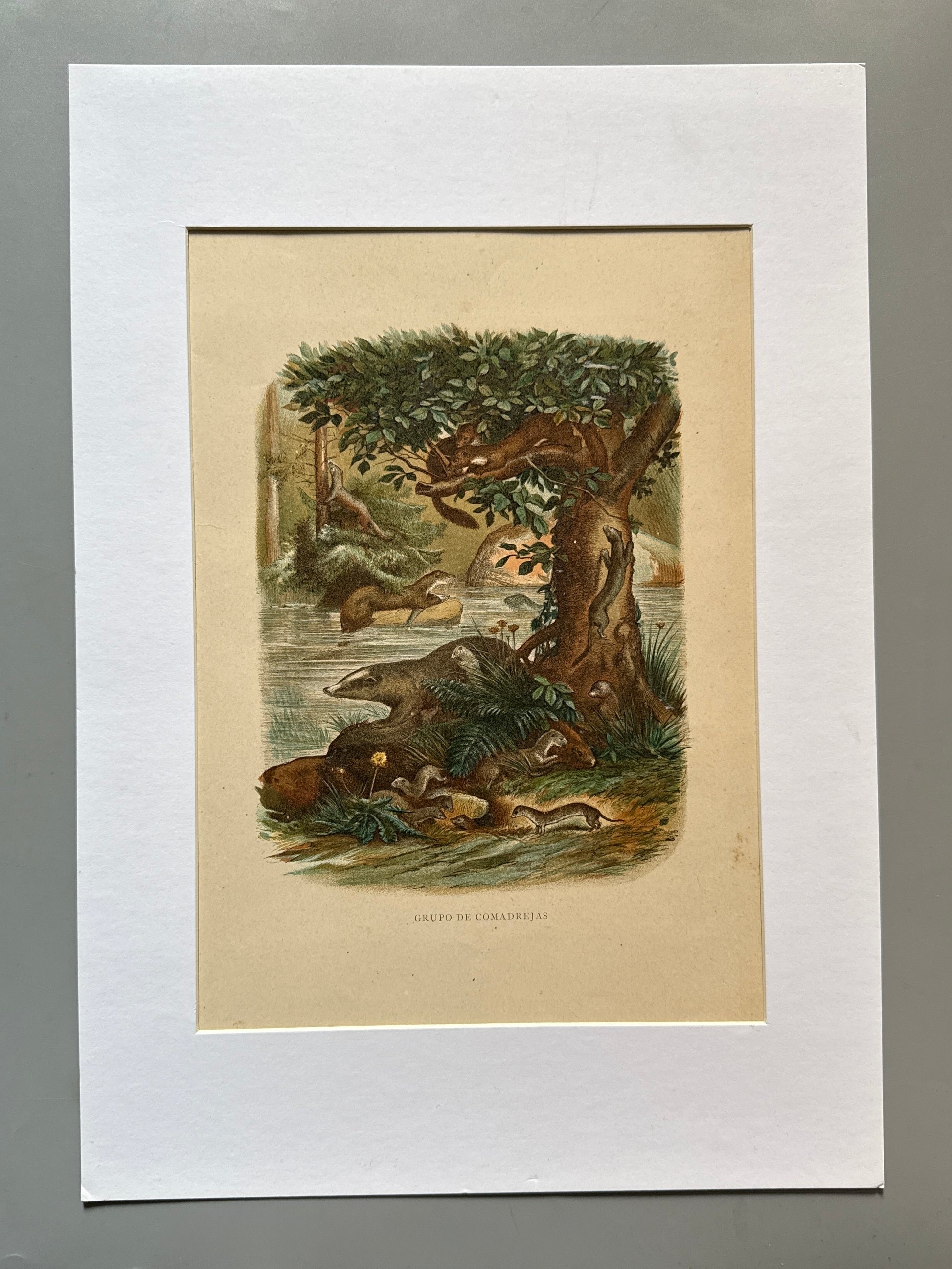 Comadrejas. Cromolitografía procedente de la obra "Historia Natural" editada por Montaner y Simón en 1876. Incluye Paspartú, A3.