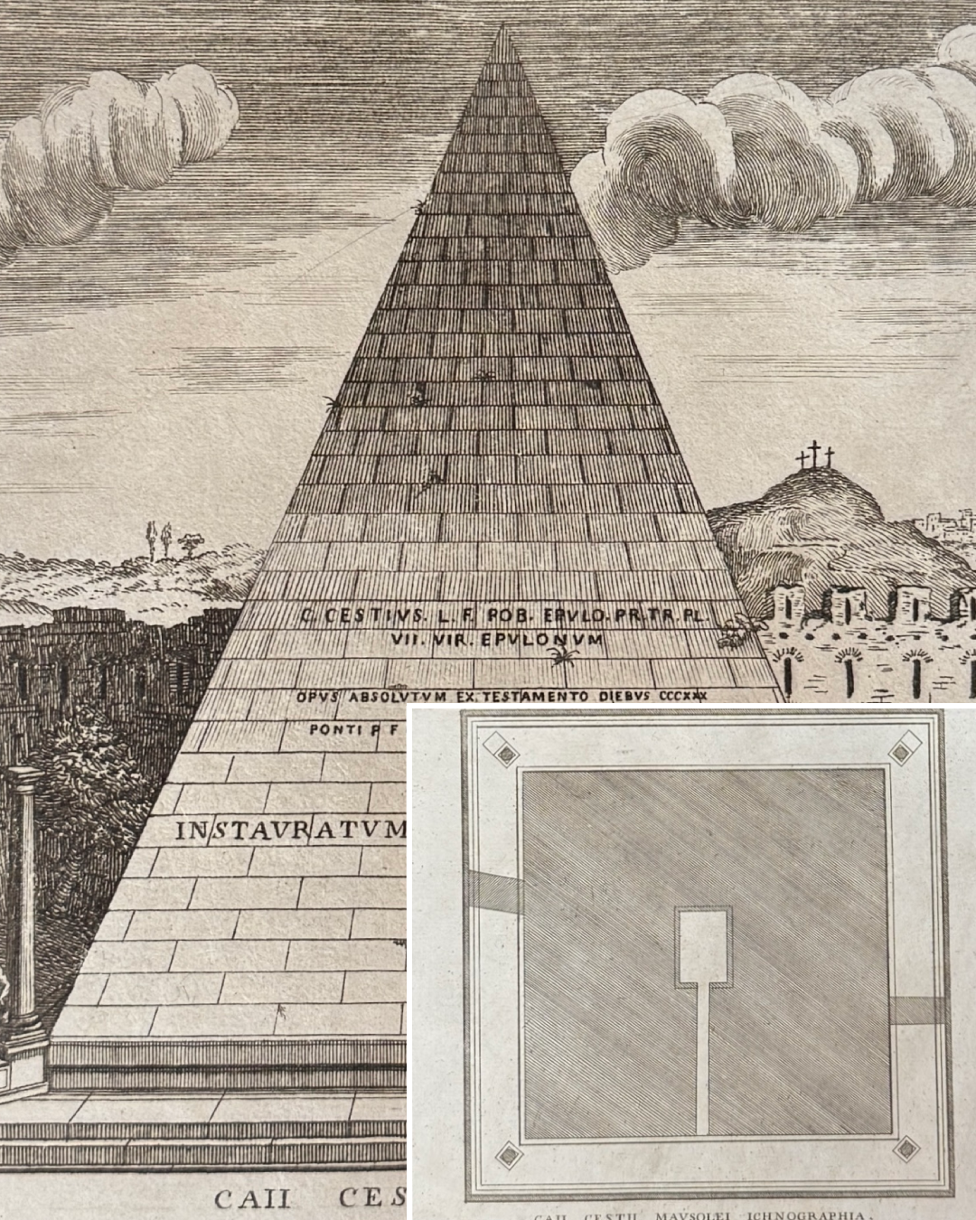 Planta y alzado de la tumba de Cayo Celestio, 18-12 aC. Grabado "Caii Celestii Sepulcrum" + "Caii Celestii Musolei Ichnographia". Proviene de la obra "Calcografia degli edifizj di Roma", 1779. Medidas: 28 x 22cm aprox. Paspartú hecho a medida.