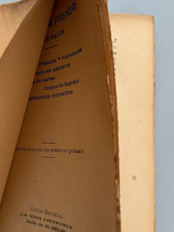Observaciones: . "Juegos de prendas, sentencias, física sin aparatos, juegos de cartas, juegos de ingenio, aritmética recreativa". Ilustrada. Encuadernación rústica. Medidas: 19 x 12cm. Editado en Barcelona, ca. 1900.