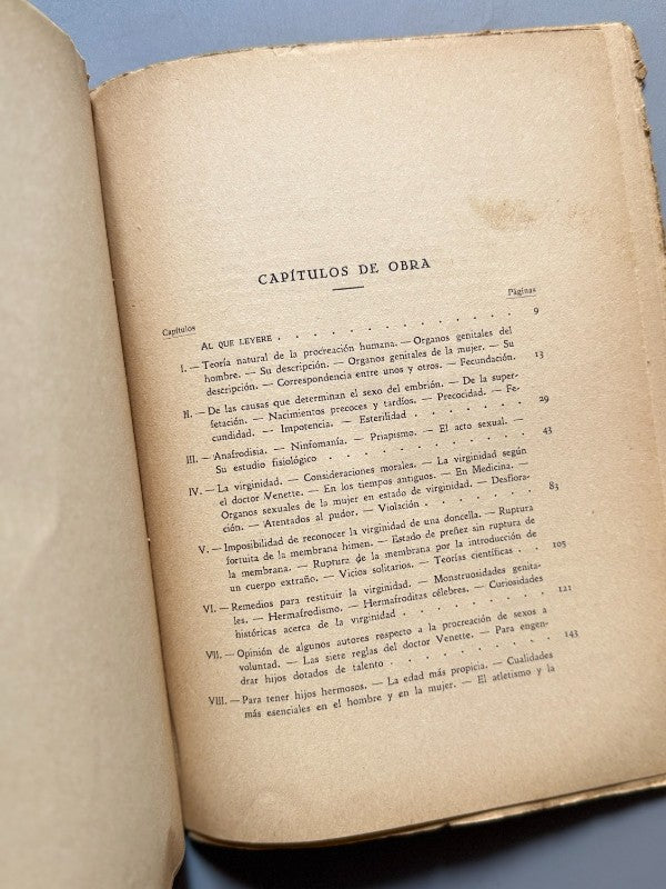 Observaciones: . "Estudio completo sobre la generación sexual; funcionamiento, transtornos, aberraciones, problemas y soluciones". Ilustrado. Algunas roturas en el interior, no afectan la legibilidad. Encuadernación rústica. Medidas: 22 x 16cm. Editado en Barcelona.