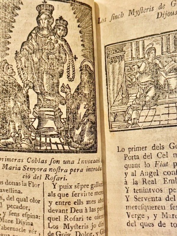 Observaciones: . "Llibre dels miracles de Nra. Sra. del Roser, y del modo de dir lo rosari de aquella". Ilustrado con viñetas xilográficas. Encuadernación holandesa del siglo XIX. Ex libris. Medidas: 15 x 10,5cm. Editado en Gerona.