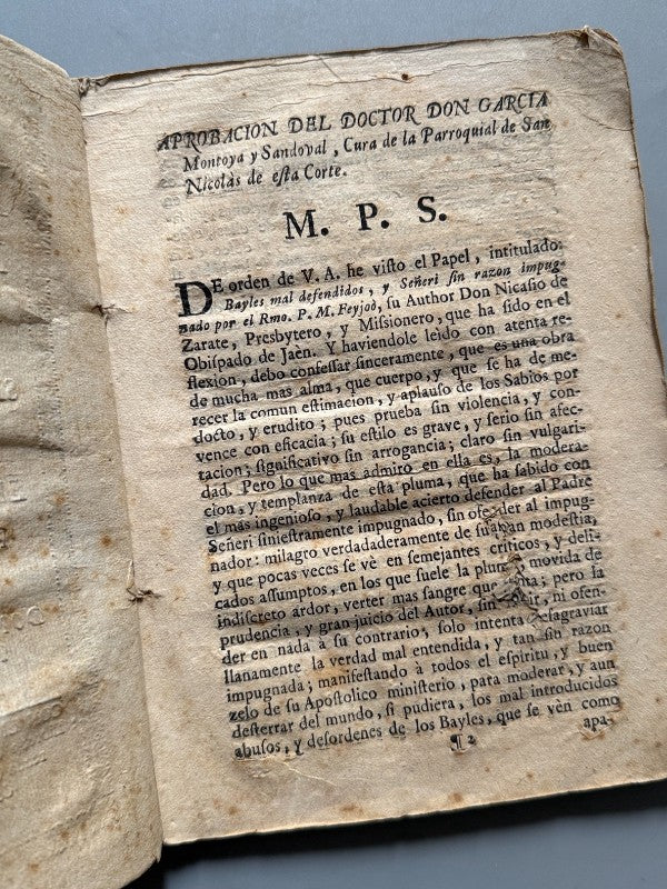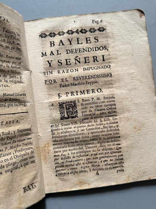 Observaciones: . "Bayles mal defendidos, y señeri sin razon impugnado por el reverendissimo padre maestro Feyjoo". Prohibición de bailes, corridas de toros y comedias. Un interesantísimo documento que evidencia los problemas morales que enfrentaba la sociedad frente a la iglesia en las costumbres populares, muchas veces consideradas como inmorales. Documento sin encuadernación. Tamaño 4º menor. La primera página y la segunda presentan un pequeño agujero que no afecta a la comprensión del texto. Raro. Medidas: 20,5 x 15cm.